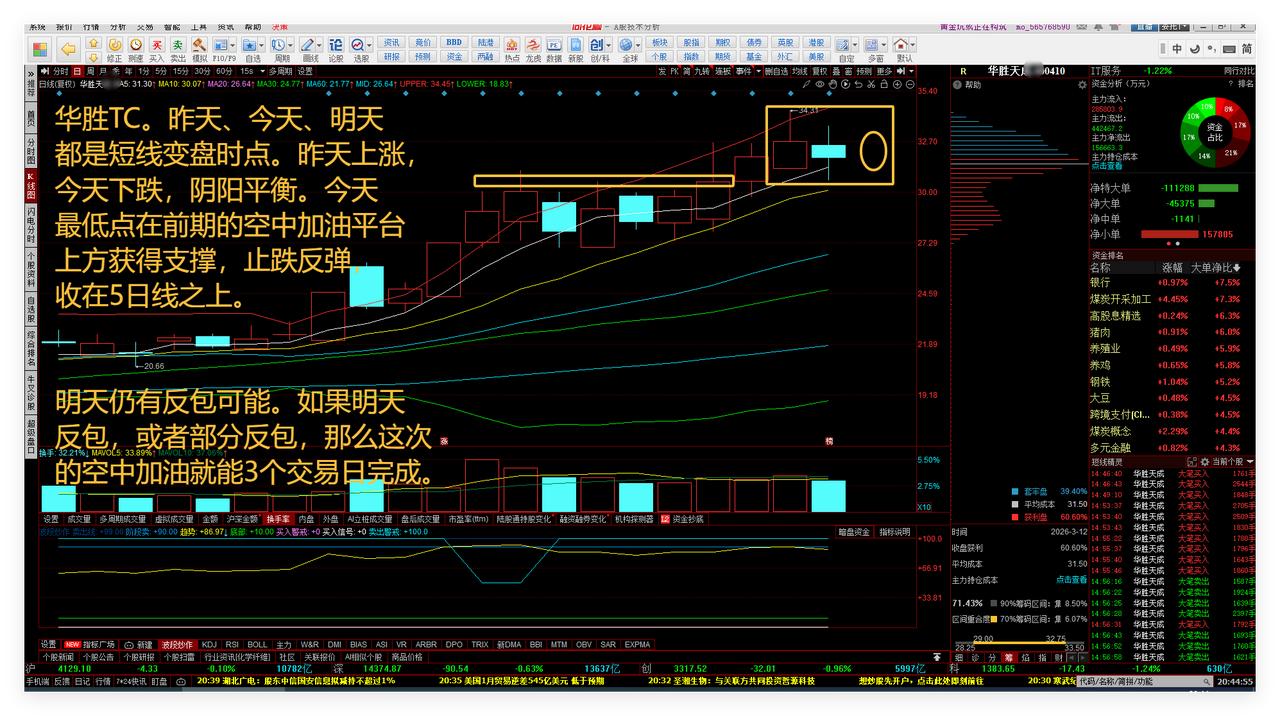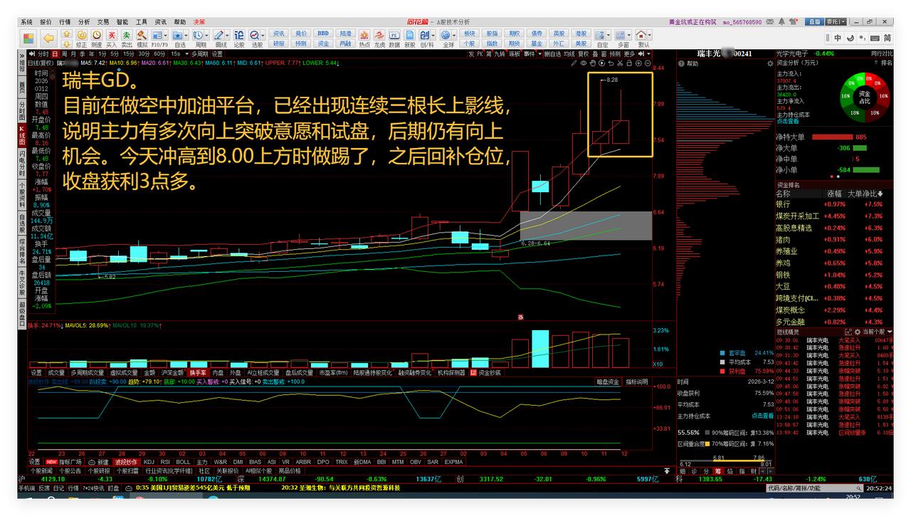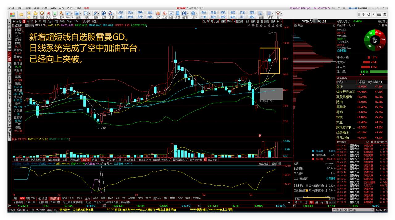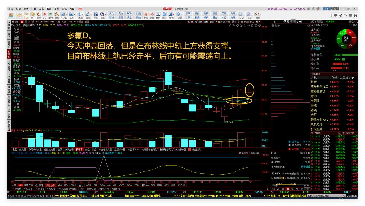 大盘仍看震荡。华胜TC。 1、大盘仍看震荡。 前段时间,分享本时段3月5日到3月20日期间,仍看横盘震荡,上面目标位置4145点,下方的中位数是4085点。 我觉得只要上证综指本时段在4085点上方运行,总体是可以持仓做多算力、电力主线方向的。敬请参阅附图1。 2、华胜TC。 昨天、今天、明天都是短线变盘时点。昨天上涨,今天下跌,阴阳平衡。 今天最低点在前期的空中加油平台上方获得支撑,止跌反弹,收在5日线之上。明天仍有反包可能。 如果明天反包,或者部分反包,那么这次的空中加油就能3个交易日完成。今天也做踢了,获利了。敬请参阅附图2。 3、瑞丰GD。 目前在做空中加油平台,已经出现连续三根长上影线,说明主力有多次向上突破意愿和试盘,后期仍有向上机会。今天冲高到8.00上方时做踢了,之后回补仓位,收盘获利3点多。敬请参阅附图3。 4、多氟D。 今天冲高回落,但是在布林线中轨上方获得支撑。目前布林线上轨已经走平,后市有可能震荡向上。敬请参阅附图4。 5、新增超短线自选股雷曼GD。 日线系统完成了空中加油平台,已经向上突破。敬请参阅附图5。