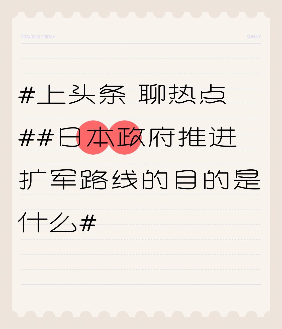 日本政府近期推进的扩军路线,核心目的是通过系统性“再军事化”,彻底突破战后和平宪法的束缚,将自卫队改造为具备进攻能力的军事力量。这具体体现在以下几个层面: · 战略野心:从“专守防卫”转向“进攻”:核心是构建“防区外打击能力”。日本已开始部署射程超1000公里的改进型12式反舰导弹,并引进美制“战斧”巡航导弹。官方将其包装为“反击能力”,实为谋求“对敌基地攻击能力”,甚至可能用于先发制人打击。 · 组织转型:打造联合作战与太空力量:2026年3月23日,自卫队实施大规模改组: · 海上:新设“水上舰队”统一指挥,并组建“水陆两栖机雷战群”,强化与陆上夺岛部队的配合。 · 航空:大幅扩编太空部队,计划年底更名为“航空宇宙自卫队”,以强化情报侦察与太空战能力。 · 情报:新设“情报作战集团”,专门应对所谓“认知战”。 · 制度松绑:预算激增与产业动员: · 巨额预算:2026财年防卫预算已突破9万亿日元,提前实现了GDP占比2%的目标。 · 产业国有化:正推进军需生产设施国有化,意图建立由政府主导的“新型军工复合体”。 · 国内政治:右翼势力与军国主义遗毒:右翼政客利用经济低迷和社会焦虑,通过渲染“外部威胁”为扩军制造借口。这本质上是对战后国际秩序的挑战,其“新型军国主义”动向已引发国际社会高度警惕。 日本的这些动作正在严重破坏地区和平稳定,其从“和平国家”转向“能战国家”的趋势值得密切关注。