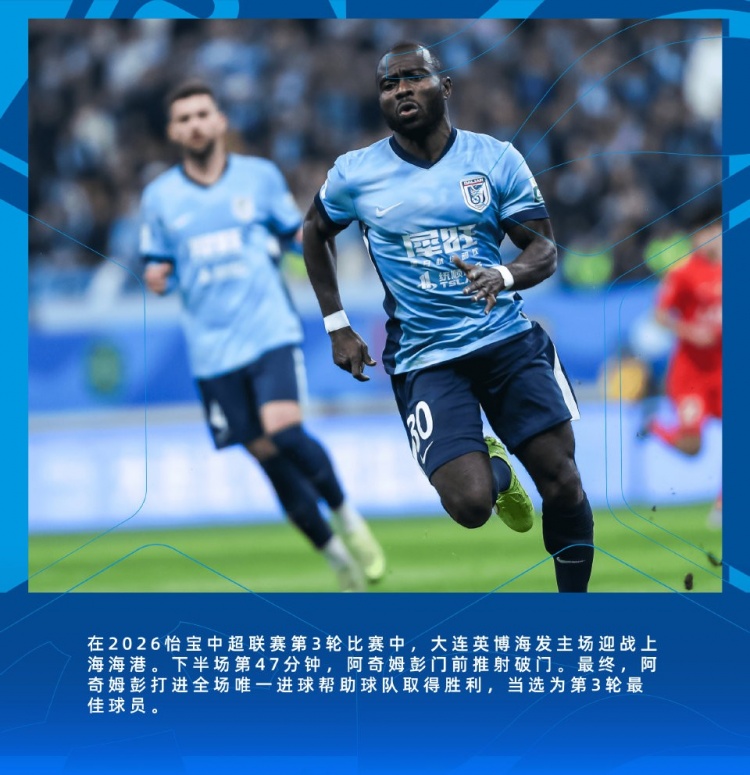 直播吧3月24日讯中超联赛今日官方公布了联赛第3轮最佳球员得主,大连英博外援阿奇姆彭当选。