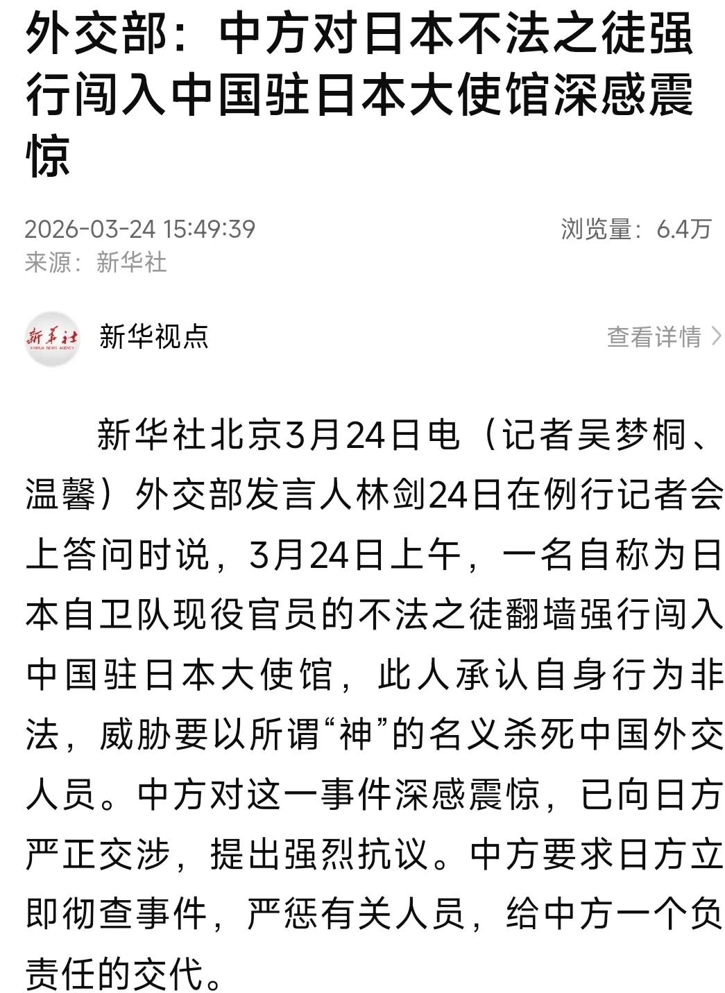 2026年3月24日上午,日本东京,一场发生在中国驻日大使馆门口的闹剧让外界瞠目。 一个自称是日本自卫队现役官员的人,竟然无视最基本的外交礼仪,强行闯入中国使馆,还扬言要用“神”的名义对馆内中国外交人员进行人身威胁。 这种行为不仅违反了《维也纳外交关系公约》中关于使馆安全和外交尊重的基本原则,更让中日之间本就敏感的关系,再添一层阴云。 事件发生后,中国外交部第一时间表达了强烈震惊。发言人的措辞不是“例行操作”,而是直指日方责任,并提出严正交涉和抗议。 可以想象,一个自卫队现役人员竟能如此任性进出使馆大门,这背后的管理漏洞令人难以忽视。 更可怕的是,这并非“一时冲动”,而是赤裸裸地挑衅和威胁——“以神之名”,仿佛是极端势力新一代的怪诞口号。 不少观察人士指出,这样的行为绝不是孤立现象。近年来日本社会内部激进言论频发,极右翼团体活动渐趋高调,对华政策越来越不遮掩地带有对抗色彩。 尤其是高市早苗等政客频繁在涉台、历史等领域发声,将中日关系推向紧张边缘。 舆论逐渐形成一种“新型军国主义”的危险倾向,使得极端个人敢于冒天下之大不韪,在中日交往的关键场所做出危险举动。 对于中国而言,类似事件触碰了国家安全和外交尊严的底线。中国方面强烈要求日本政府彻查此事,并对肇事者依法追责,给中国一个明确且可靠的交代。 与此同时,在大使馆安保上出现如此明显的失职,无论是自卫队还是警方,都难辞其咎。 对外交人员而言,使馆本应是最安全的地方,如今却因个别极端分子的失控变得不再平静。 事件引发中日网友广泛讨论,不少人怒不可遏,质问日本政府是否真能管住“极端分子”。 如果日方不能采取切实措施保障中国外交人员的安全,不但会造成更大的国际影响,也为中日在未来出现更深层次的摩擦埋下隐患。 中方已经亮出强硬态度,日方若继续放任自流,势必承担后果。这起事件,无疑成为检验两国诚意与能力的风向标。