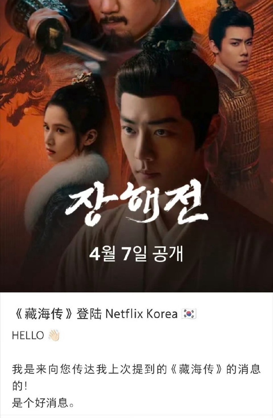 韩国Netflix购买了藏海传播放版权4.7日上线