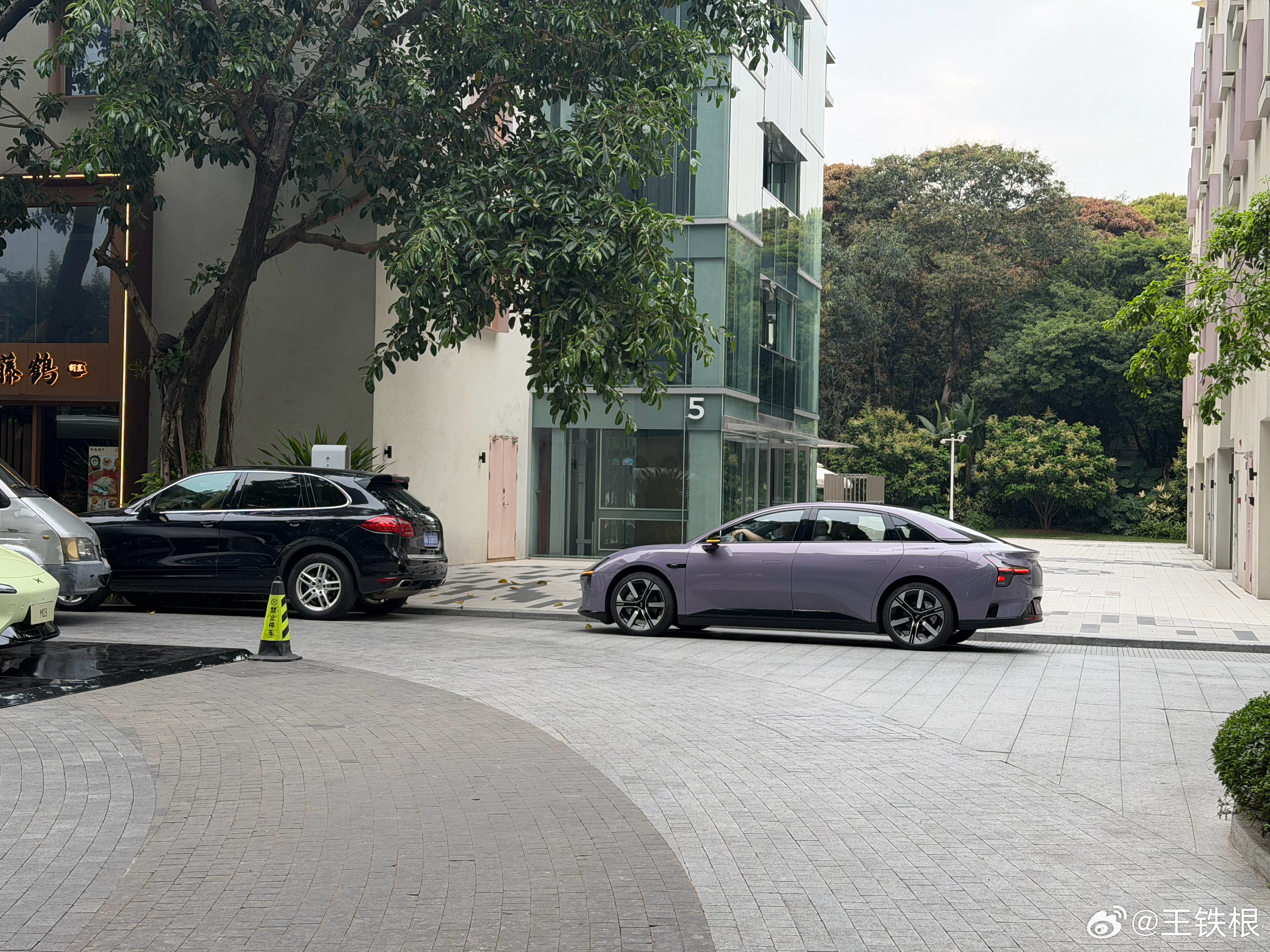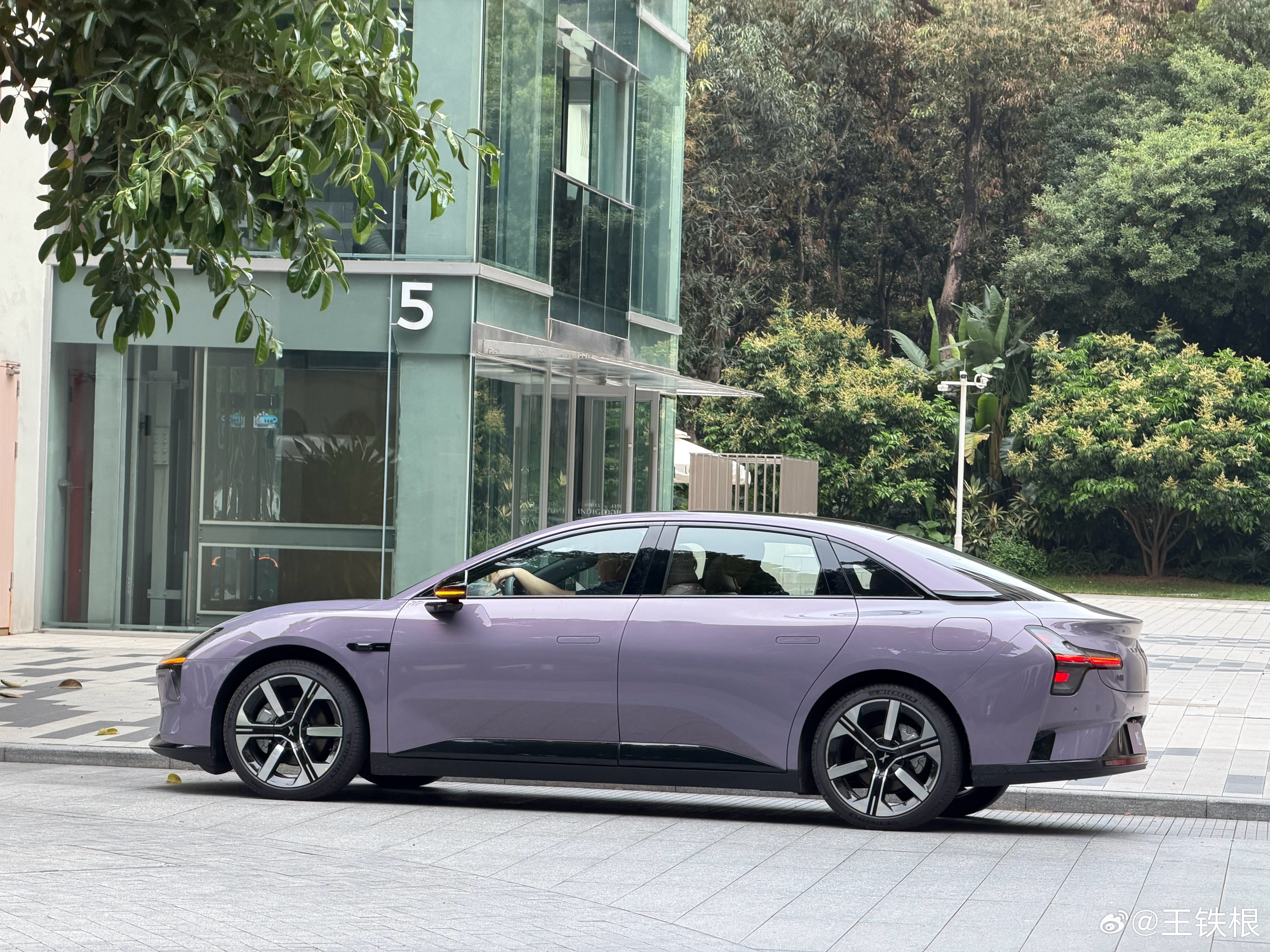 这个紫mona刚好和卡宴以接近角度停在一起,可以看到大车轮带来的视觉效果相当不错,而且新车车漆特亮,光影好看。再一个,虽然此车L113短,但是前悬同样短,优秀的轮高比,溜背设计,车门下方的黑色饰板,整体形成了非常低趴、流线、运动的造型。