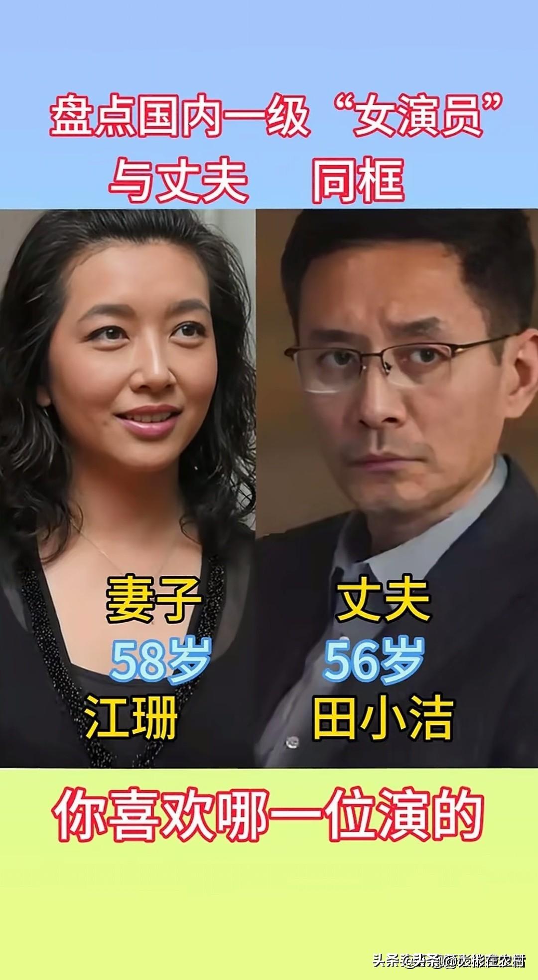 盘点国家一级演员与丈夫同框,看着他们同框的画面很温馨,很般配,你最喜欢哪一对呢? 我个人更喜欢江珊夫妻俩。 咱先说说江珊,1967年生在江苏镇江。 这么多年,她很少上综艺瞎折腾,就踏踏实实演戏。 早年那部《过把瘾》,那是真火遍大江南北!她演的杜梅,留着那个年代最时髦的短发,性格有点小性儿、爱撒娇,但对感情那是真执着。 后来她在《永不放弃》里演医生,又是一身白大褂,说话干脆利落,那种职业女性的专业感立马就出来了。 这就是好演员的本事,不用靠大浓妆,换个发型、换身衣服,那就是另外一个人。 再说说她丈夫田小洁,虽然平时不显山不露水,但也是个“剧抛脸”的好演员。 你看他在《激情燃烧的岁月》里的表现,把那个年代军人的愣劲儿演得入木三分。 这夫妻俩有个最大的共同点:低调!从来不拿私生活炒作,也没那些乱七八糟的绯闻,就是安安静静把戏演好,把日子过好。 江珊胜在柔情似水又有韧劲,田小洁胜在朴实稳重。 这两口的结合,那是真正的“强强联手”,靠实力说话。 你喜欢他俩吗?