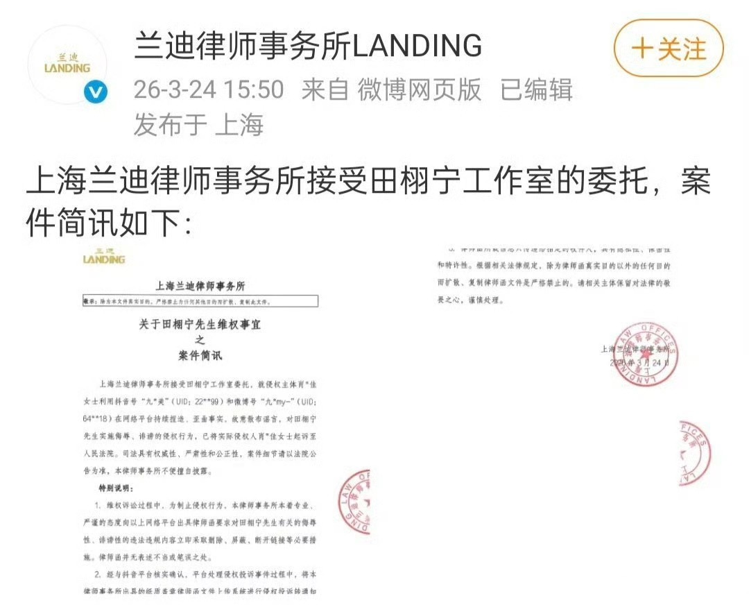 律所发布田栩宁维权案件简讯 田栩宁 九成美这男的没完没了,自己躲背后装死一声不吭