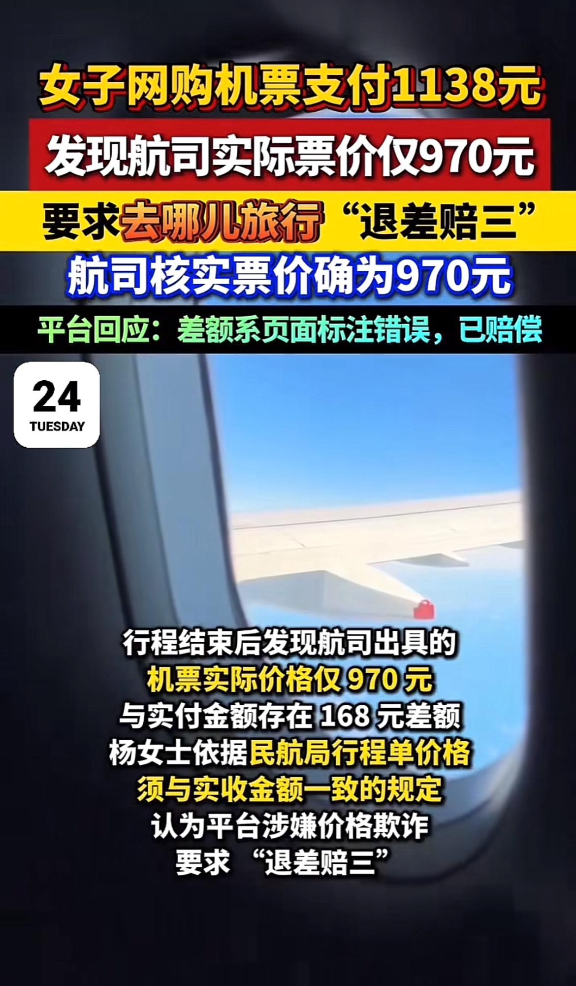 网购机票差价问题最近可闹得挺火。就说杨女士,2026年1月在“去哪儿旅行”APP花1138元买机票,结果行程单显示实际票价才970元,差了168元。她要求“退差赔三”,和平台沟通后,最终达成和解。 还有吴某,2024年6月花4199元买机票,实际金额3270元,差了近千元。他起诉要求退还机票款并三倍赔偿,代理公司称是票价实时变动等因素导致。虽然公司退回了差价,但法院怎么判还得看具体情况。遇到这种事,消费者维权是应该的,就看最后能不能得到满意的结果啦。
