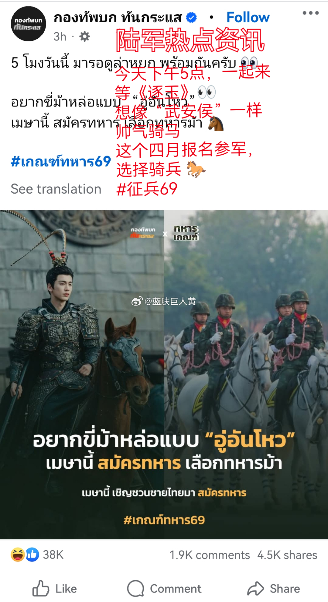 泰国陆军宣传号挂中国电视剧《逐玉》的剧照,试图让泰国女生劝自己的男友当兵