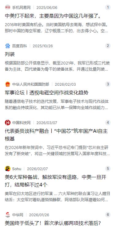 中美打不起来,主要是因为中国这几年强了。2016年时美国有机会。当时美国航母去南海,想试探中国。那时中国的海空军差,辽宁舰是二手的,出去得小心。空军就歼-10C、歼-16,数量少,打不过美国。而且中国那时防空驱逐舰不多,根本打不过美国航母。 麻烦看官老爷们右上角点击一下“关注”,既方便您进行讨论和分享,又能给您带来更多优质的内容,感谢您的支持! 2016年那会儿,南海的局势确实紧张得很。美国两个航母战斗群开进来,说是“自由航行”,实际上谁都看得出来,这是在试探咱们的底线。那阵子中国海军啥情况?就一艘辽宁舰,还是从乌克兰买回来的壳子改造的,说实话就是条训练舰,真拉出去跟美军航母硬碰硬,心里真没底。空军那边虽然已经有了歼-10C和歼-16,但数量少,体系也没成型。防空驱逐舰掰着手指头都能数过来,跟美军航母战斗群比,差的不是一星半点。那时候要是真擦枪走火,咱们确实不占优势。 但也就是从那年开始,中国军队像是按下了快进键。海军的造舰速度就跟下饺子似的,每年下水的吨位抵得上一个中等强国的海军。现在咱们手里可不只辽宁舰了,国产航母一艘接一艘服役,055万吨大驱那更是世界一流水平,雷达、导弹、防空样样拿得出手。空军这边,歼-20隐身战斗机批量列装部队,这东西可是五代机,能跟美军F-22掰手腕的。再加上歼-16、歼-10C这些战机数量也上来了,整个空中作战体系跟2016年比,完全是两个概念。 更关键的是,咱们现在不光是装备多了,更重要的是打法变了。电子战这块进步特别快,用国防部官网的话说,电磁空间作战已经从“支援保障”变成了“作战手段”。什么意思呢?就是以前电子对抗是给火力打击打辅助的,现在它自己能直接决定战场胜负。有报道说,解放军能用车载电子战系统模拟航母编队信号,把美军P-8A侦察机忽悠得在海上兜了45分钟圈子。这种能力,2016年的时候想都不敢想。 导弹这块更是咱们的杀手锏。东风-21D、东风-26这些“航母杀手”,射程覆盖到关岛,末端还能变轨,美军现有的防空系统拦起来非常吃力。东风-17就更厉害了,高超音速滑翔弹头,飞行轨迹飘忽不定,现有的反导预警体系基本没法提前预判。美国国防部自己都承认,中国陆基洲际导弹发射载具的数量已经超过了美国,而且咱们的导弹都是近些年新造的,美国那边“民兵-3”都服役四五十年了,老胳膊老腿的,可靠性根本没得比。 海空力量之外,科技底子也跟上来了。芯片这块虽然还在攻坚,但进展实实在在。2026年新年贺词里专门提到“芯片自主研发有了新突破”。现在咱们28纳米以上的成熟制程已经能完全国产化,14纳米FinFET工艺正在全力攻关,7纳米也在稳步推进。EDA工具、刻蚀机这些关键环节,国内都有企业能顶上来了。这意味着什么?意味着不管外部怎么封锁,咱们的军工生产不会被人卡脖子。 2026年初有消息说,美国一份机密报告外泄,里面首次承认中国在电子战和导弹领域已经超越了美军。这话从美国人嘴里说出来,分量不一样。要知道美国军方过去十几年做了无数次兵推,模拟台海冲突,结果几乎都是美国战败。这不是吹出来的,是咱们这些年一步一个脚印走出来的。 现在回头看2016年,美国航母来南海,那是真有机会。当时咱们的“区域拒止”能力还没完全建起来,美军航母战斗群在南海确实可以横着走。但今天不一样了。咱们有覆盖整个西太平洋的侦察体系,天上有高分卫星、无侦-8高空高速无人机,海上有055驱逐舰、航母编队,水下有攻击核潜艇,岸上有东风导弹。美军航母再来南海,它的一举一动都在咱们眼皮子底下,东风快递随时可以上门服务。 美国现在也明白这个道理了。以前航母进南海是施压,现在进来就是当活靶子。所以这几年你看美军在南海的动作,虽然还在搞“自由航行”,但航线明显避开了咱们岛礁的12海里范围,军舰和军舰之间也保持着安全距离,谁也不愿真的擦枪走火。这不是美国人变客气了,是他们算过账了——真打起来,代价他们扛不住。 中美打不起来,不是靠嘴上说说的和平愿望,是靠硬实力撑起来的战略威慑。2016年那会儿,咱们手里牌少,心里多少有点虚。现在牌多了,底气自然就足了。从辽宁舰这个“二手货”到三艘航母,从歼-10到歼-20,从几十枚反舰导弹到上千枚各型导弹覆盖整个第一岛链,这十年走下来,咱们把美军在西太平洋的军事优势一点点给抹平了。 有人说中美迟早有一战,这话说得太绝对。大国之间打仗,从来不是看谁嗓门大,而是看谁承受不起代价。2016年美军敢来试探,是因为那时候代价可控。现在再来试探,代价就变成了一艘航母、几千号官兵、几十年积累的军事声誉——这笔账,谁都得掂量掂量。咱们不惹事,但也不怕事,手里有家伙,心里不慌,这才是中美之间能维持和平的真正原因。