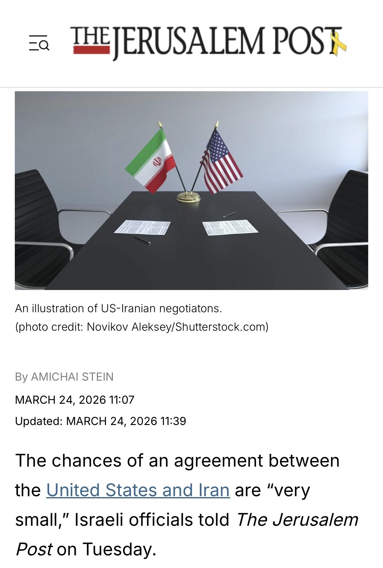 以媒:以色列官员表示,美伊达成协议的可能性“非常小” 以色列《耶路撒冷邮报》官网3月24日报道:以色列官员周二告诉《耶路撒冷邮报》,美国和伊朗之间达成协议的机会“非常小”(The chances of an agreement between the United States and Iran are “very small,” Israeli officials told The Jerusalem Post on Tuesday)。 报道说,这一分歧不仅源于美国的要求——包括对伊朗核计划、弹道导弹以及霍尔木兹海峡航行自由的限制——也源于伊朗的要求。“目前,伊朗方面坚持要求美国做出赔偿,并要求美国政府保证,在任何协议中都不会对伊朗采取进一步行动”,两名参与调解工作的消息人士告诉《耶路撒冷邮报》。 报道说,尽管美国总统特朗普就谈判进展发表了不少言论,但一位熟悉细节的消息人士表示,美军在中东的部署仍在照常进行中。增援部队包括美国海军陆战队,其目的是为了能够夺取位于霍尔木兹海峡的伊朗哈尔克石油岛(Iran’s Kharg oil island in the Strait of Hormuz)。 报道说,特朗普尚未决定是否发起地面行动来夺取该岛,这有助于确保航行自由。而夺岛决定部分取决于华盛顿和德黑兰之间正在进行的谈判。 报道说,一位美国消息人士告诉《耶路撒冷邮报》,“空袭正按计划继续进行”。而以色列官员也表示,与美军的协调或作战计划没有变化。“一切照常进行。美国的作战计划没有变化,我们也没有看到任何此类变化”,一位以色列消息人士表示。 报道的原标题是《Chances of US-Iran deal 'very small,' Israeli officials tell 'Post'》(以色列官员向《邮报》表示,美伊达成协议的可能性“非常小”)。