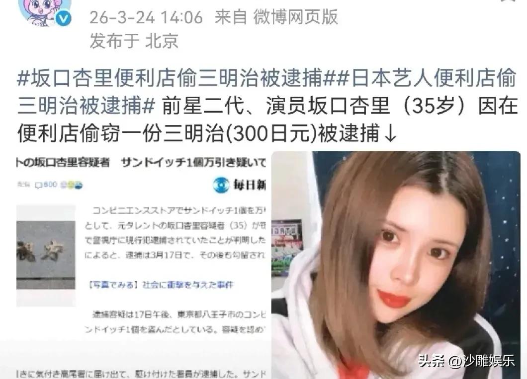 这是今天娱乐圈最荒唐的事! 3月24日下午,正当整个娱乐圈静悄悄、没什么大瓜可吃的时候,日本方面突然传来一则让人瞠目结舌的消息——35岁的前星二代、演员坂口杏里,竟然因为偷窃一份价值300日元(约合人民币15元)的三明治,被警方当场逮捕。 没错,不是名包,不是珠宝,而是一份便利店货架上最普通的三明治。 消息一出,中日两国网友集体炸锅,热搜直接冲上榜一。有人说她疯了,有人心疼她落魄,更多人则是满脑子问号:这到底是人性的沦丧,还是命运的无情捉弄? 提起坂口杏里,老一辈日剧迷应该不陌生。她的母亲坂口良子,是日本昭和时代的知名女演员,家喻户晓。顶着“星二代”的光环出道,坂口杏里早年资源不差,参演过不少影视剧,一度被业内看好,前途似乎一片光明。 可谁也没想到,十几年后的今天,她会以这样一种方式重新回到大众视野——不是因为作品,不是因为演技,而是因为一份三明治。 据日本警方披露,事发当天,坂口杏里走进东京某便利店,趁店员不备,将一份三明治塞进随身物品中,未结账便径直离开。店员发现后立刻报警,警方很快在店外将她抓获。面对证据,她供认不讳。 300日元,折合人民币也就15块钱。说实话,这点钱连一杯奶茶都买不起。以她曾经的咖位,哪怕现在落魄了,也不至于为了这点东西铤而走险。 说句实话,这件事荒唐归荒唐,但我笑不出来。 一个从小被光环笼罩的星二代,35岁沦落到偷便利店三明治被抓,这背后折射出的,是娱乐圈残酷的生存法则,也是一个人彻底滑落的真实写照。 坂口杏里这些年过得并不好。母亲去世后,她的演艺事业急转直下,后来又被曝出沉迷牛郎店、挥霍无度,甚至一度转行做陪酒女郎。从荧幕前光鲜亮丽的女演员,到深夜街头谋生的陪酒女,再到今天因偷窃被捕——这一路下坠的轨迹,清晰得让人心寒。 300日元的三明治,像一面照妖镜,照出了她人生最后的体面已经荡然无存。 有人会问:她真的穷到连三明治都买不起吗?我更倾向于认为,这不是穷的问题,而是心态崩了。当一个人长期处于低谷,精神压力、社会孤立、经济窘迫叠加在一起,做出非理性的行为,并不稀奇。 真正让人唏嘘的是,她明明有一副好牌,却一步步打成了今天这副模样。星二代的光环,没能成为她的保护伞,反而成了她坠落后最刺眼的对比。 目前,案件还在进一步处理中。而这场“300日元的失足”,注定会成为她演艺生涯中无法抹去的污点。