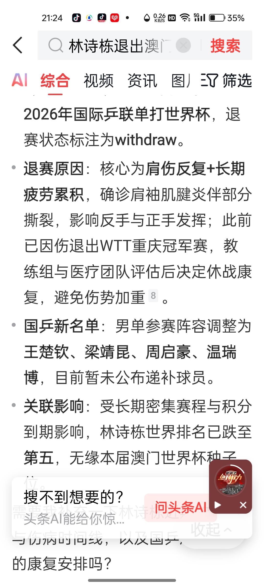 什么情况,林诗栋退出了澳门乒球世界杯赛! 林诗栋这次退赛了,他的世界排名会跌倒第几呢!世界杯退赛了,那么百年盛典的伦敦世乒赛呢! 中国乒协的多事之秋! 其实,林诗栋退出也好,以他现在的状态,在澳门世界杯赛上,也出不了什么好成绩,排名要跌就跌到和林诗栋真正实力相匹配的排位上吧,然后再一步一个脚印朝前冲吧!