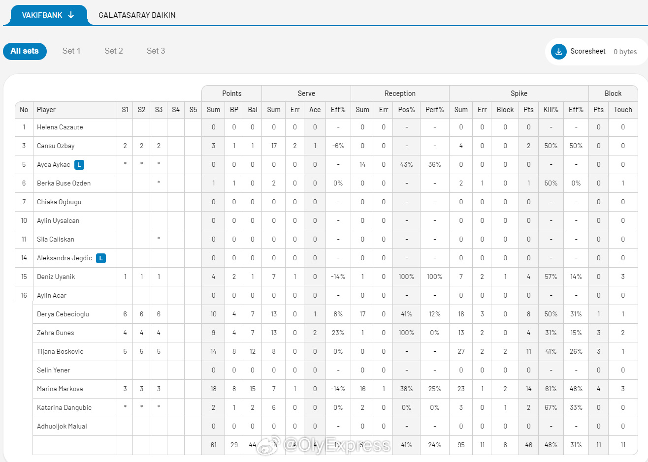 【女排土耳其杯半决赛瓦基弗零封加拉塔萨雷 王媛媛5分】国际排坛战报速递中国排球留洋动态 3月24日伊斯坦布尔,女排土耳其杯半决赛,瓦基弗银行3-0(25-19/25-20/25-16)零封加拉塔萨雷,将与费内巴切和伊萨奇巴希的胜者争夺冠军。马尔科娃18分、博斯科维奇14分、塞贝西奥格鲁10分,卡鲁塔苏11分、王媛媛5分(7扣3中2拦)。