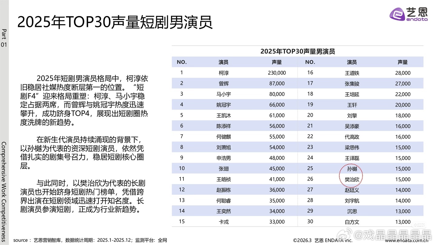 艺恩出了2025-2026短剧演员商业价值热度报告,目前男演员声量排第一的还是柯