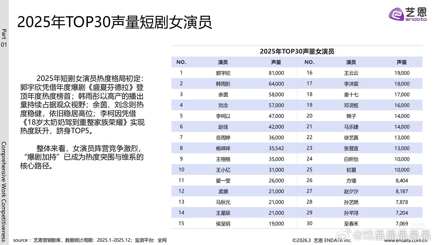 艺恩出了2025-2026短剧演员商业价值热度报告,目前男演员声量排第一的还是柯淳,女演员排第一的是郭宇欣。