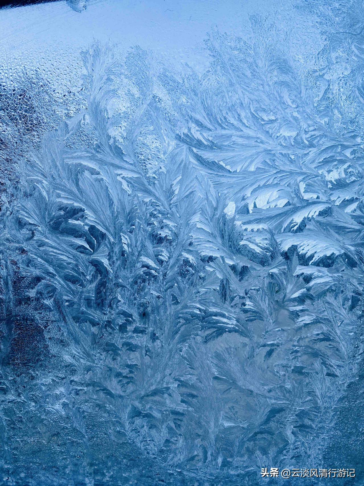 好在天公作美,昨天夜晚的一场雪,让党岭的群山再披银装,霜花挂满枝桠,在碧蓝天空的映衬下,美不胜收!露营的车窗玻璃上,还结出了酷似枝叶的冰花,令人颇感奇特,也算略微安抚了些失落。