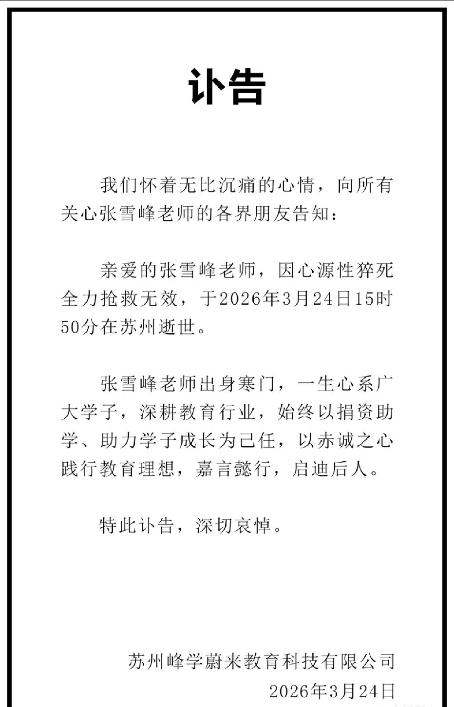张雪峰老师,您一路走好! 今天本来是个再平常不过的日子,直到手机屏幕突然弹出张雪峰老师去世的消息,我整个人都愣住了。 第一反应是:这肯定是谣言吧?毕竟前几天还听说他因为身体不舒服,取消了好几场讲座,但谁能想到,情况会这么严重! 直到看到他团队正式发布的讣告,我才不得不相信这个残酷的事实,那个永远充满激情、为我们指点迷津的老师,真的离开了。 去年八月,我有幸参加了张老师在我们本地的一场讲座。现场座无虚席,他的眼神里全是光,讲起知识来那种发自内心的热情和自信,到现在都让我记忆犹新。 说实话,我家并没有正在上高中的孩子,但张老师那句“育人先育德”的教育理念,真的深深打动了我。 他不仅仅是在教人怎么选专业、怎么考高分,更是在教人怎么成为一个更好的人。 现在,我手机里还存着那天讲座时拍的照片和录音,没想到这些竟成了最珍贵的回忆。看着照片里那个神采飞扬的他,心里真不是滋味。 张老师的离开,不仅是教育界的损失,更是无数家庭的遗憾。他用自己的方式,为那么多普通孩子点亮了前行的路。我想,最好的纪念,或许就是记住他的精神,继续好好生活。 张雪峰老师,您一路走好!