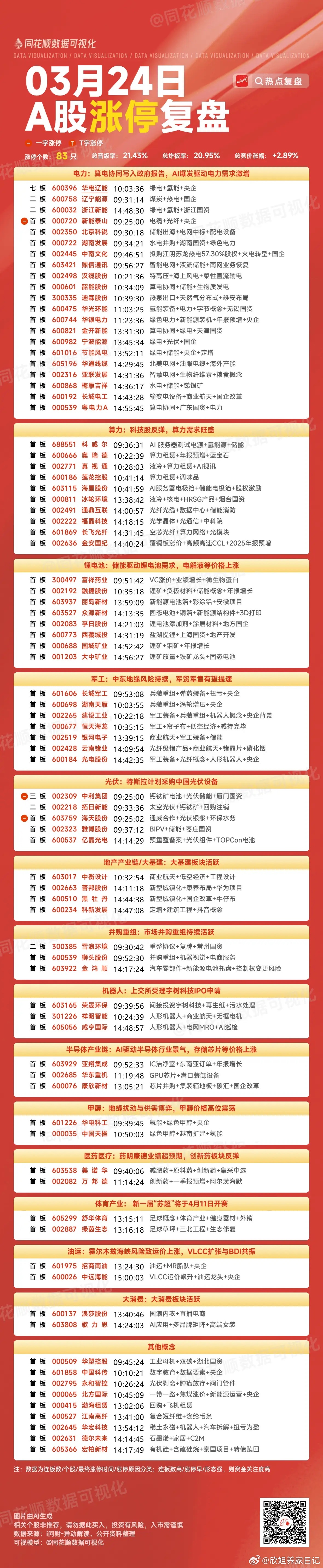 3月24日,涨停复盘(100只),主要包括电力、算力、锂电池、军工、地产产业链板块。