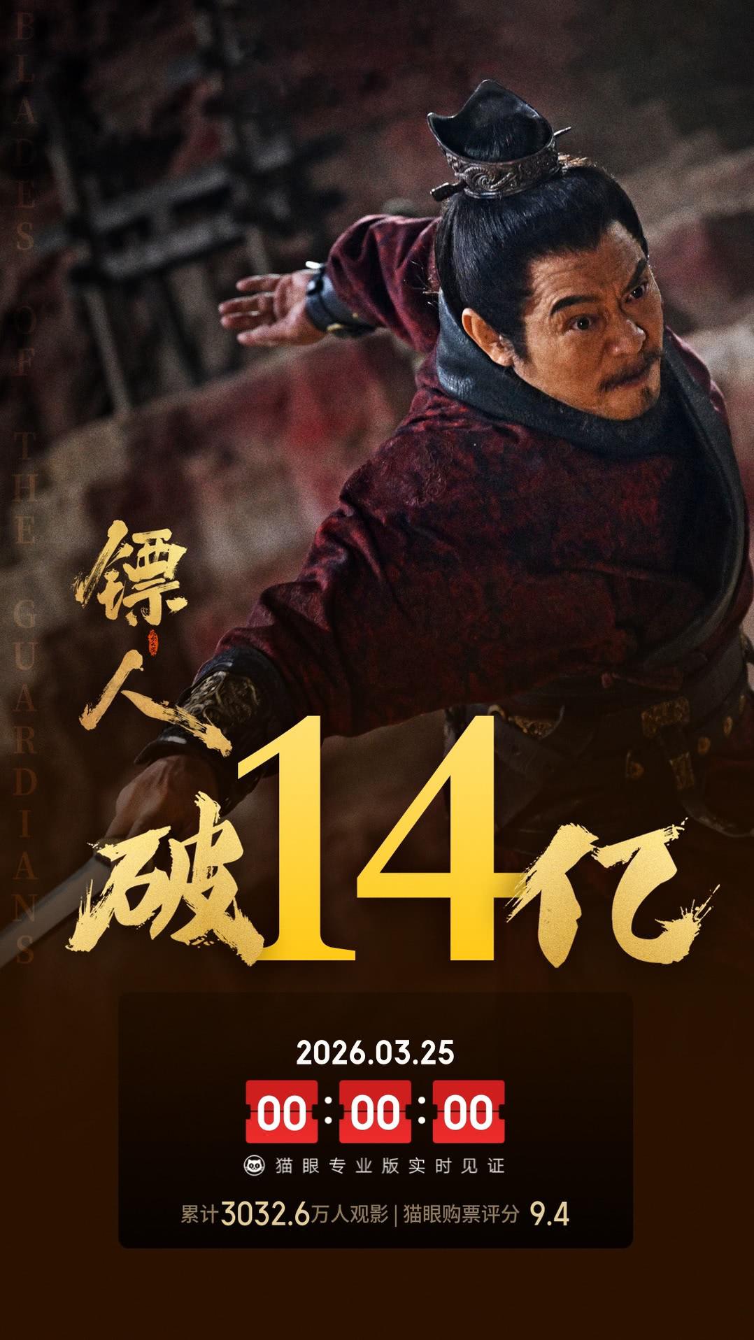 《镖人:风起大漠》票房破14亿,超越《泰坦尼克号》。 由袁和平执导,吴京、谢霆锋、于适、陈丽君、孙艺洲、此沙、李云霄领衔主演,梁家辉特别演出,张晋友情主演,惠英红友情演出,张译友情客串,李连杰特别友情出演,刘耀文、熊瑾怡、莒谦朗、白那日苏、梁壁萤、文俊辉、董思成、林秋楠、景瓷、张艺泷、李嘉辉主演,寇占文、代乐乐、释彦能、徐向东、淳于珊珊、孟鹤堂、于荣光友情出演的武侠电影《镖人:风起大漠》累计综合票房破14亿,超越《头号玩家》、《速度与激情9》、《泰坦尼克号》、《后来的我们》、《一出好戏》等片,进入内地影史票房总榜75强、春节档历史24强。 不出意外的话,14亿也会是《镖人:风起大漠》跨过的最后一个亿元线。 由于票房集中补报等原因,《镖人》单日票房出现波动,在上映第36天首次超越《飞驰人生3》。不过《镖人》最终票房也只会是无限接近于《飞驰人生3》的三分之一。
