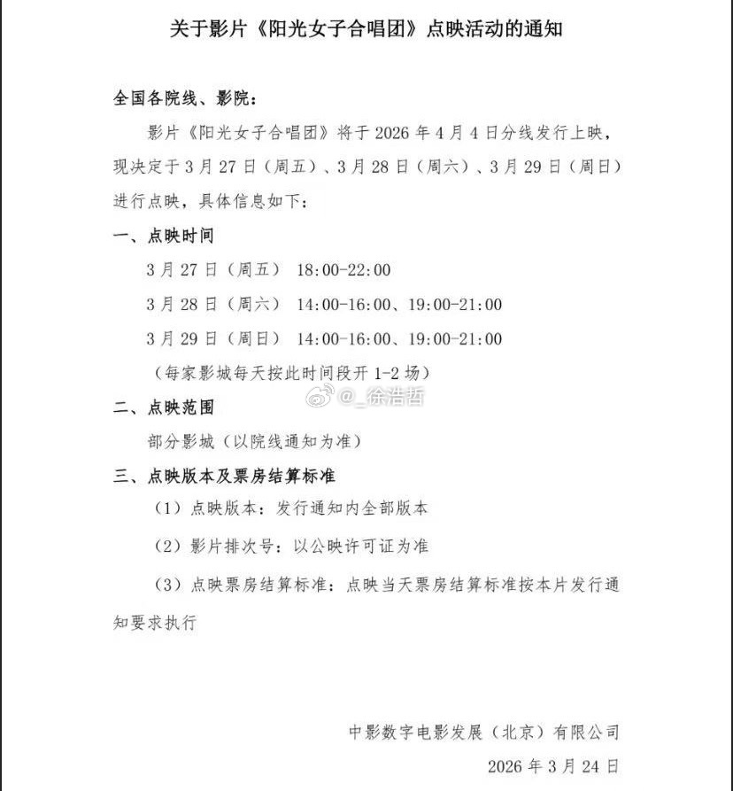 清明档第二部电影发行通知已出炉电影《阳光女子合唱团》将于4月4日早上9:00开始放映 片长134分钟左右本片采用分线发行 仅在部分影院上映以院线通知为准 不过有cinity版本另外本片将于3.27-3.29进行点映,具体信息见图二电影阳光女子合唱团