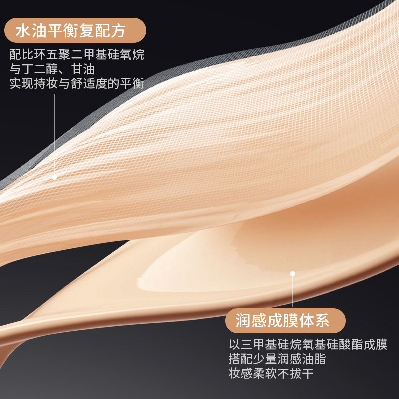 创新油膜锁水结构+润感成膜体系,上脸是清透的柔雾裸妆感,不厚重、不假面,伪素颜妈生好皮既视感拉满,社交距离看完全像天生好肤质~