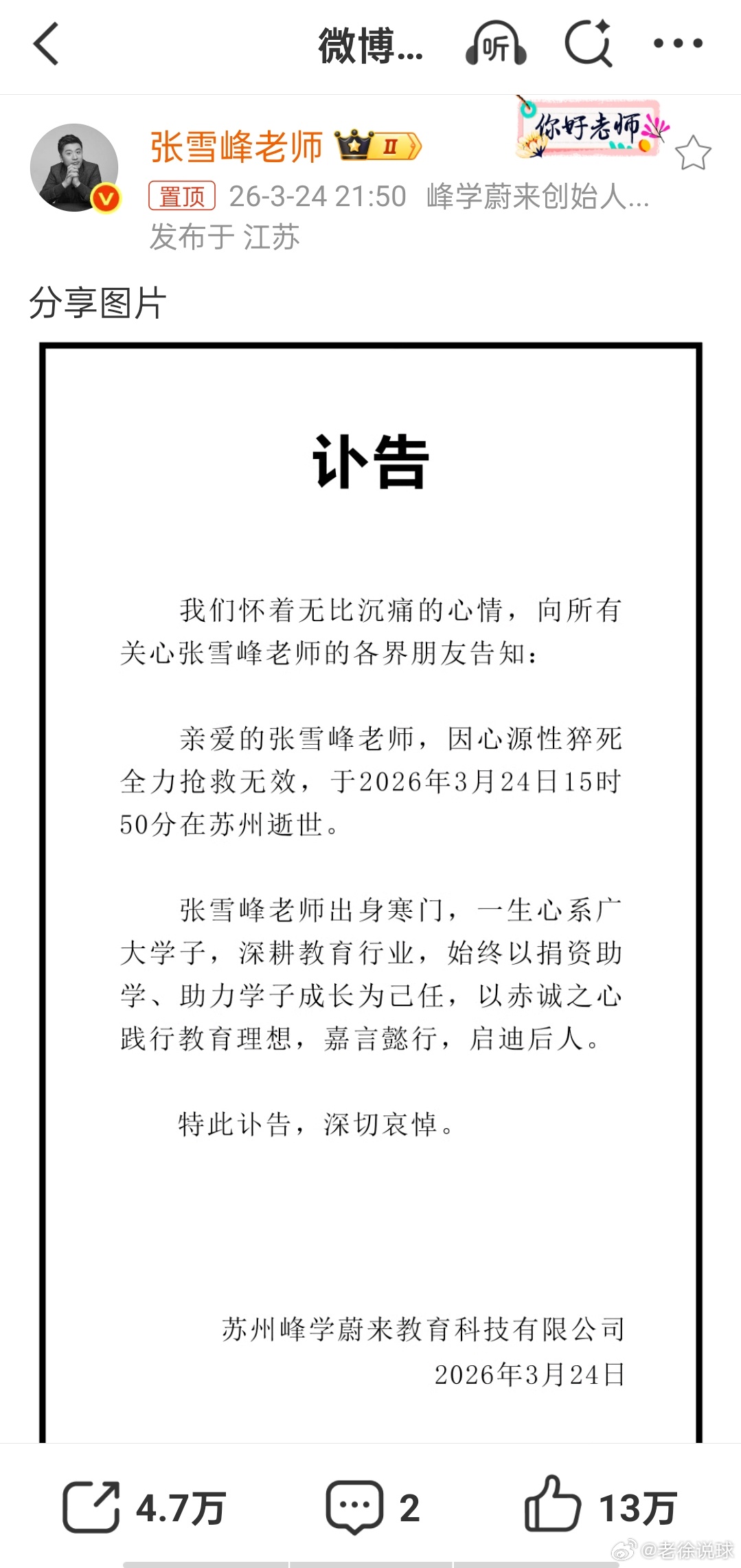 张雪峰公司发布讣告张雪峰去世张雪峰 再也不熬夜了,现在就去睡觉祝一路走好