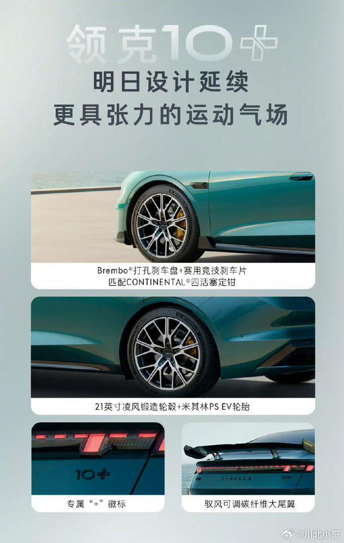 专属赛影蓝车漆独具格调,弱光静谧深邃,强光青芒流转,光影变幻间尽显高级质感。两段式手动调节碳纤维大尾翼,车尾专属“+”性能徽标,搭配Brembo大尺寸打孔刹车盘、continental定钳与21寸锻造轮毂,赛道级硬件悉数登场。