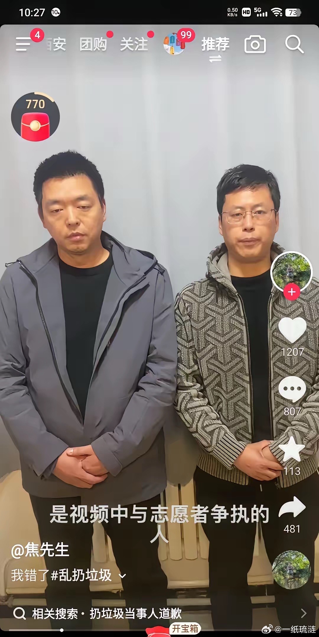确定了,扔瓶子的叫 张鹏举,想要打人指责志愿者的叫焦铁力,张鹏举在超市工作,焦铁力从事医疗器械推销,并非某院在编人员。他们今天出来向广大群众道歉,我觉得鞠躬只是表象,真正的道歉是像志愿者一样去清山,用实际行动去证明自己的诚意。网友的评论亮了!要真正道歉,维护大美秦岭,我建议你们以后也当两个捡垃圾清山的志愿者,那时候才是真真正正的道歉,光大人民群众会接受你们的道歉,并为你们的义举点赞!!!