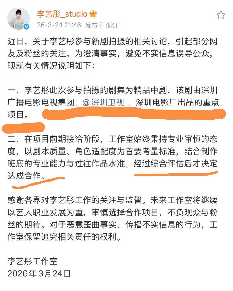 李艺彤 短剧不 要 听 风 就 是 雨 啊,看 到 啥 都 说 是 短 剧,这是 深圳 卫 视 的 精 品 中 剧,现 在 的 剧 目 多 元 化 其 实 是 好 事 李艺彤方回应演短剧 李艺彤参与拍摄的为精品中剧