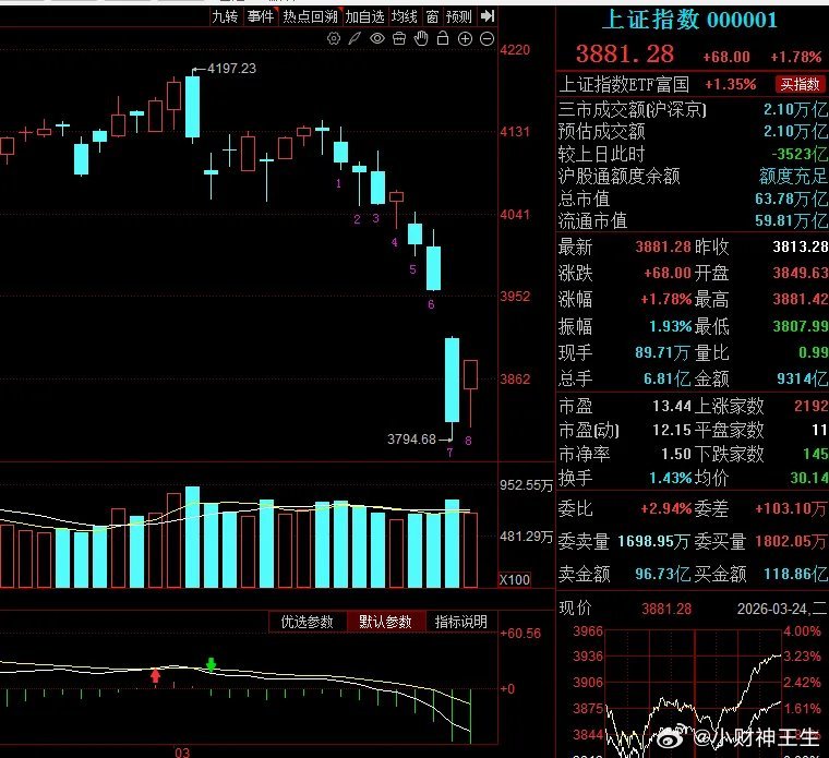 A股:明天周三大盘市场如何走?废话不多说,直接上答案! 明天继续收红,指数震荡为主。 大盘指数报3881.28点,涨1.78%,收出光头带下影中阳线,完成超跌修复,短期多头信号密集, 3880点压力站稳就是动力,明日延续上涨概率较高。