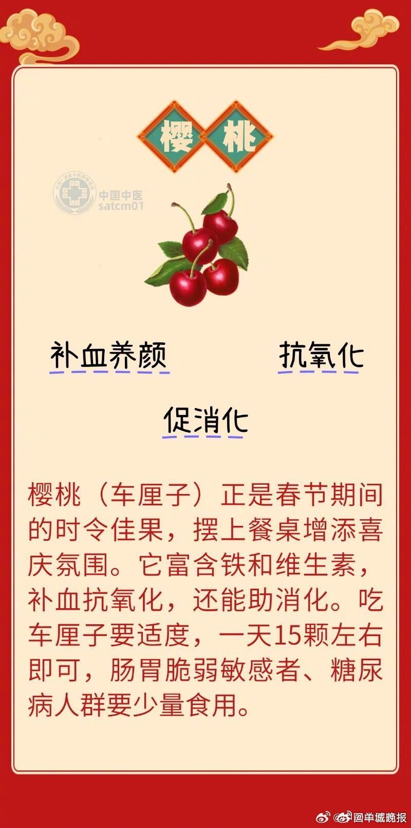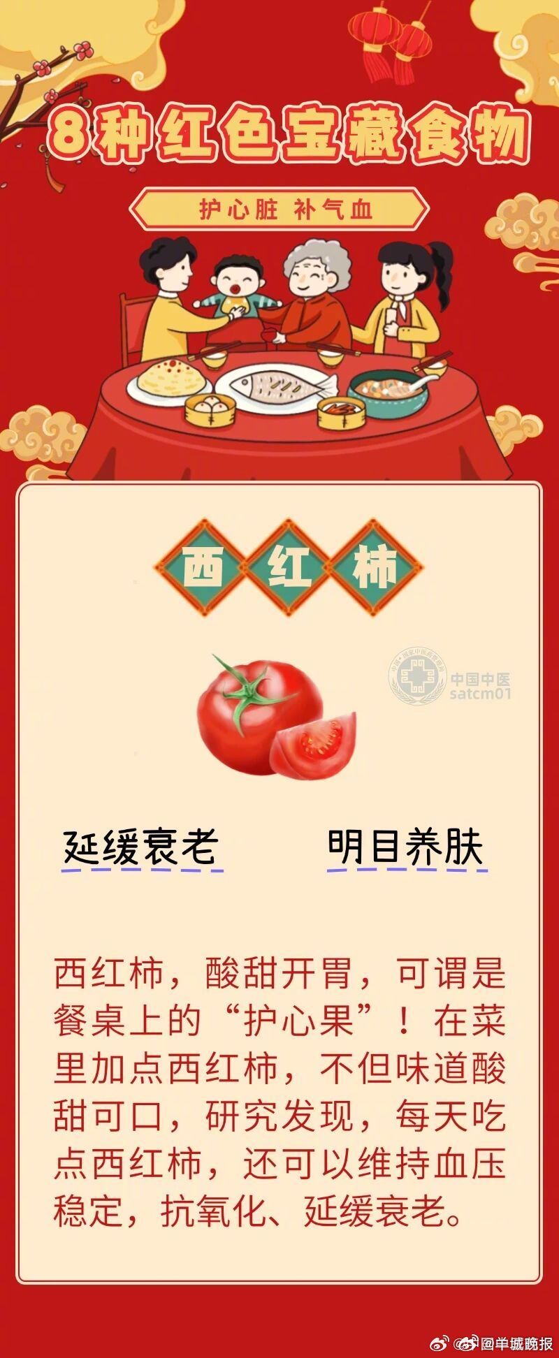 【#8种红色宝藏食材补气血#】想要养出好状态、不妨从餐桌上的红色食物开始。红色,是喜庆的吉祥色,更是守护心血管、调养身心的养生色。中医素有“五色入五脏”的经典理论,其中红色入心,正是养心补血、调和气血的上佳之选。番茄红素、花青素、胡萝卜素等天然营养,都是藏在红色食材里的“护心良方”与“补血好物”。为大家推荐8种“红色宝藏食材”,帮你养出红润好气色,祝大家活力满满、安康顺遂!快来看看你日常都吃过哪几种~评论区聊聊↓↓#心脏骤停前有征兆##容易触发猝死的6个因素##出现猝死征兆如何自救##心源性猝死##AED#(中国医药报)(编辑:惠天骄;审签:周乐瑞)
