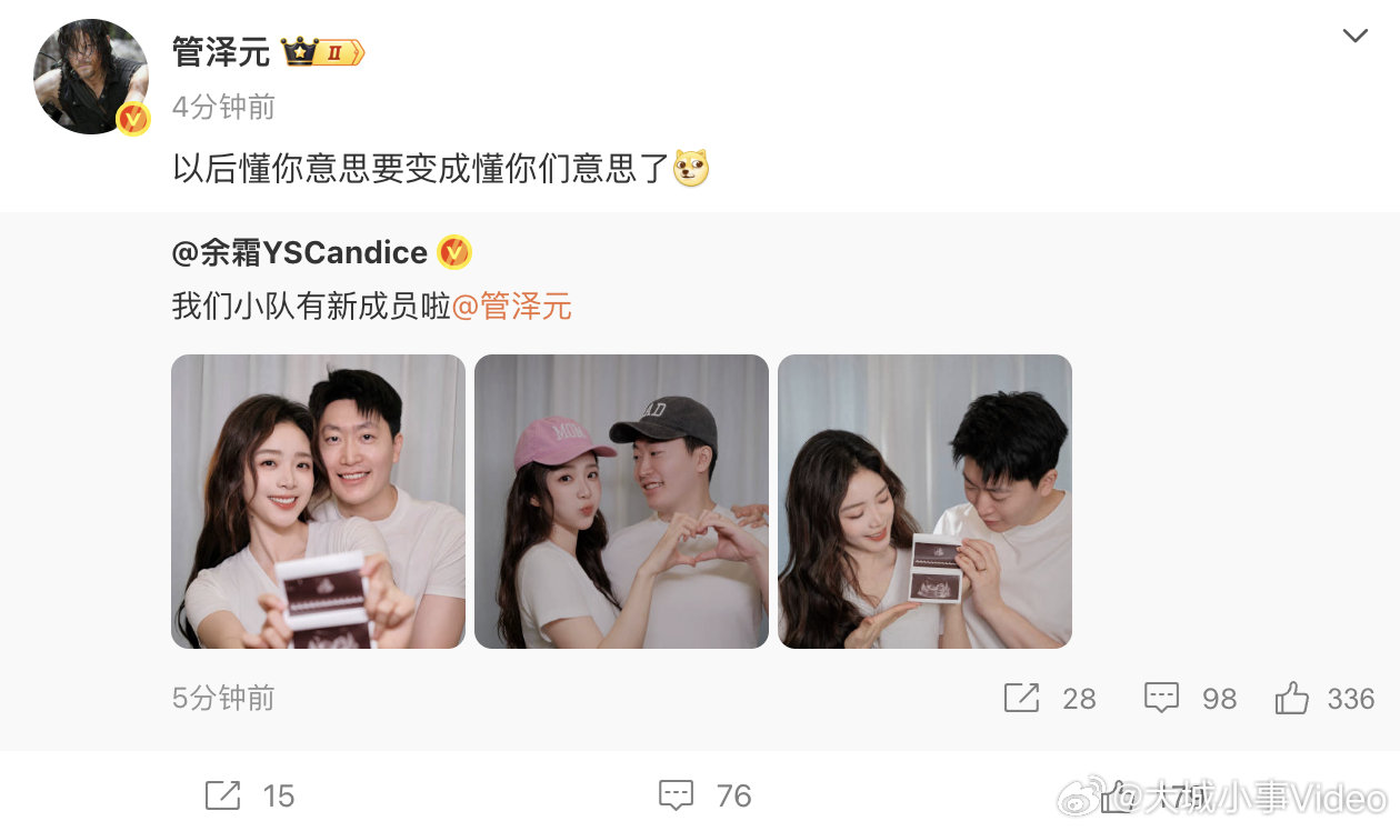 【余霜官宣怀孕】管泽元余霜升级做爸妈 3月24日,官宣升级做爸妈。