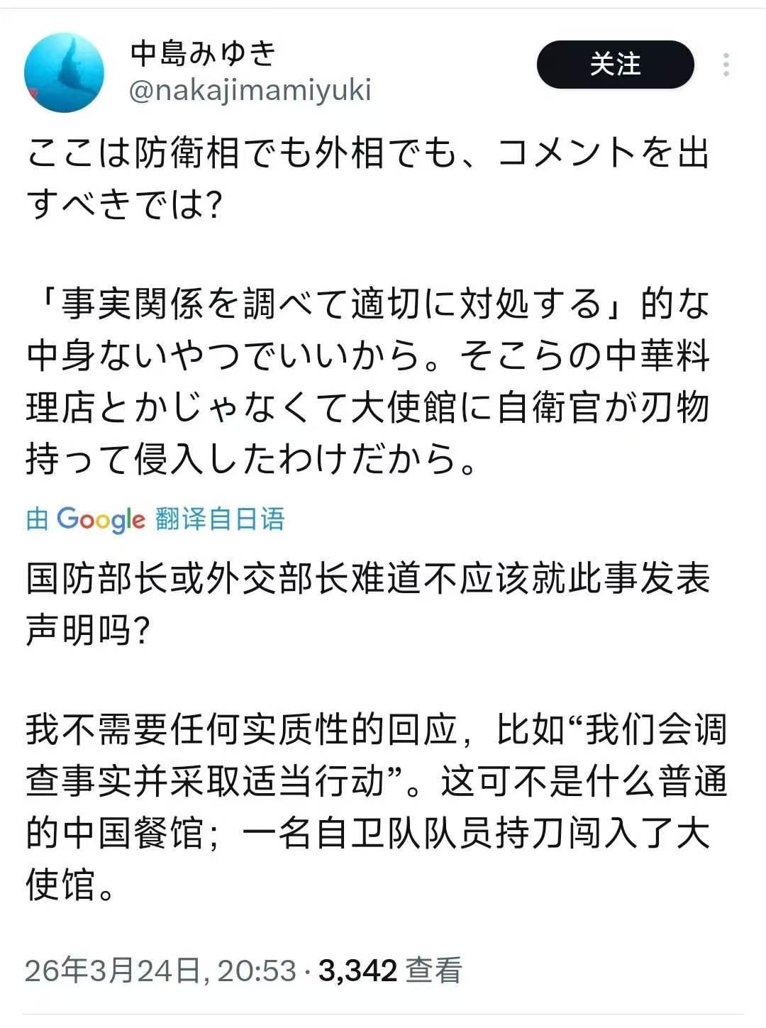 发生了什么?日本人也看在眼里!中島みゆき”昨晚发文:“这里难道不是连防卫大臣或外务大臣都应该发表评论的场合吗?只要内容是‘调查事实真相并采取适当措施’之类的就行。毕竟这不是普通的中餐馆,而是自卫官持刀闯入了大使馆啊。” 评两句:闯馆+媚美双暴击:日本正把自己推向危险边缘!日本人也看在眼里!中岛美雪一语点破要害:自卫官持刀闯使馆,绝非小事,更不是一句“个人行为”能糊弄。这是违反《维也纳外交公约》的严重外交事件,对比近代日本军人屡次失控越线的历史教训,极端思潮与军纪松弛的风险正在重演。高市早苗刚结束访美,大手笔投美、对华强硬表态,国内极端情绪被持续点燃。一边是政府对外激进表态,一边是现役自卫官闯馆行凶,上层煽风、下层点火,形成危险闭环。 日方必须彻查真相、严肃追责,而非敷衍了事。外交尊严零容忍!政治操弄突破安全底线,最终只会反噬日本自身,伤及地区和平。