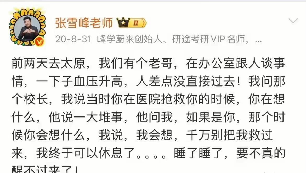 张雪峰说话很犯忌讳,话太满,太绝! 对选专业,他说的太满,招人恨! 对他自己,他说的太绝,结果应验了! 他成功靠嘴,不幸也因为嘴!去年,他的账号改因此被处理过!大家都以为他要凉了! 看今日的结果,如果他当时真的凉了,也许反而救了他一命,事业完了,好好休息! 他对专业的看法,他对考生的建议,都是好意,因为他来自于底层,在社会上历练过,比家长懂社会的规则! 他用激进的言论,唤醒了很多人,也算是行善,可是,对于他自己,未必是好事!名声有了,钱有了,可是,欲望也更大了! 盛名之下,其实难副!他还是走了!