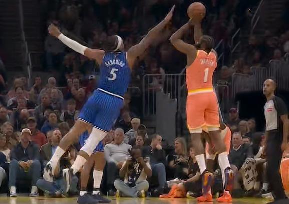 骑士52-47打停魔术的原因唯一,哈登三分! 北京时间3月25日,骑士与魔术的比赛来到第二节7分钟处,球队52-47瞬间反超直接打停莫斯利,而原因,哈登的三分。 图一:球队46-47落后,左弧顶面对霍华德,一对一单挑三分。 图二:右弧顶面对状元班凯罗,经典的后撤步三分,帮助球队52-47领先5分。 哈登连续两记三分,帮助球队52-47完成反超,打停魔术。