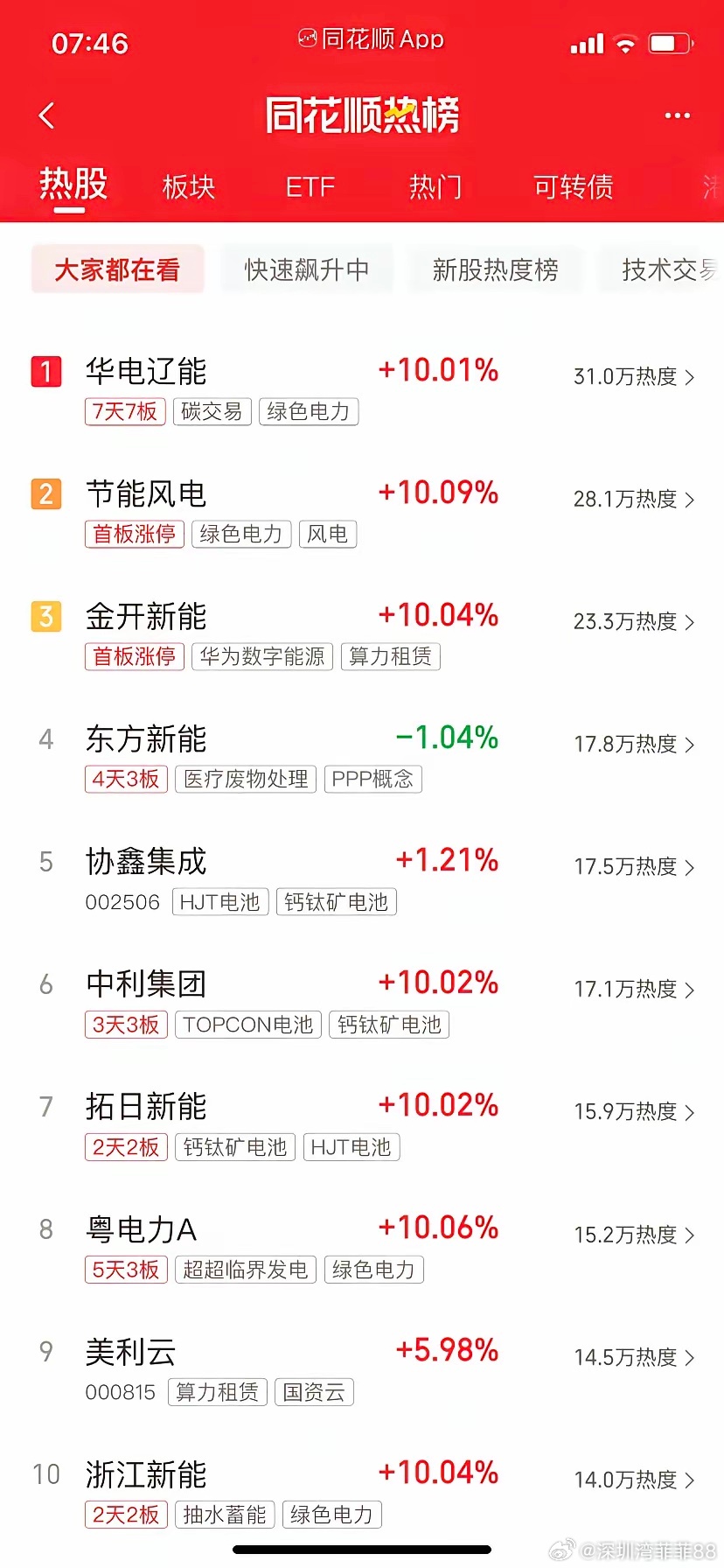 今天炒什么,一起来看看热榜第一名,华电的辽能同学,七天七进班,碳中和第二名,节能同学,风电第三名,金开同学,算力第四名,中利同学,钙钛矿电池第五名,东方的新能同学,电力,光伏设备第六名, 协鑫同学,光伏第七名,美利同学,算力第八名,紫金同学,金属铅,锌第九名,拓日同学,钙钛矿电池第十名,豫能同学,发电班级里还有其他 同学,见下。说说观点:昨天我们大a迎来缩量普涨后,今天肯定会分化。昨晚ToKen的中文命名“词元”被国家国家数据局正式官宣。那么这个肯定是利好算电方向。关于算电,算力就还是看美丽同学能否反包,可以带动板块,🥜同学也值得观看。电力,今天的华电不能再高位出现放量大阴,能稳住就可以。有可能开一字的比如贝科,辽能,新能泰。还可以观察华电l,顺纳 同学情况,以及地位的韶能,东方新两个,大中军就观察阳光。她们如果强势,那么就会带动板块起来,当然也要看指数的反馈,如果继续下探,可能又是沙与泥沙俱下场景既然是反弹就观察順指数的科技方向,比如算力,航天,海外硬件,cpo,m9等方向。大科技就看比如德明,长飞,20厘米的东田,观察他们在盘中的反馈情况。然后存储,昨天盘后佰维有15亿美元存储晶圆采购合同的消息,预计今天也会对储能板块有一定带动。航天就观察顺灏,电器,西测,昨天上班的银河即可。鉴于下半月有回收任务,估计今天开始会有资金埋伏,只适合去低吸埋伏,至于什么时候拉升就看资金选择。要不要去埋伏也看个人喜好。说一下航发,昨天最开始拉升的就是他,之后才有银河的直线拉板,所以他的地位还是一直存在的。冲突方向,油气,其实这里大家可以去看看国外公司相关的etf,她们走势基本和期货油气走势相同。化工观察金牛,宝丰即可。油气观察洲际,通源,广汇,这个方向真不好做,节奏不对就容易站岗,现在的量化恶心到极致,一高开就砸下来。并且反复收割,因此千万别追高。