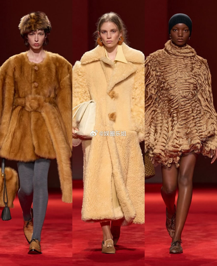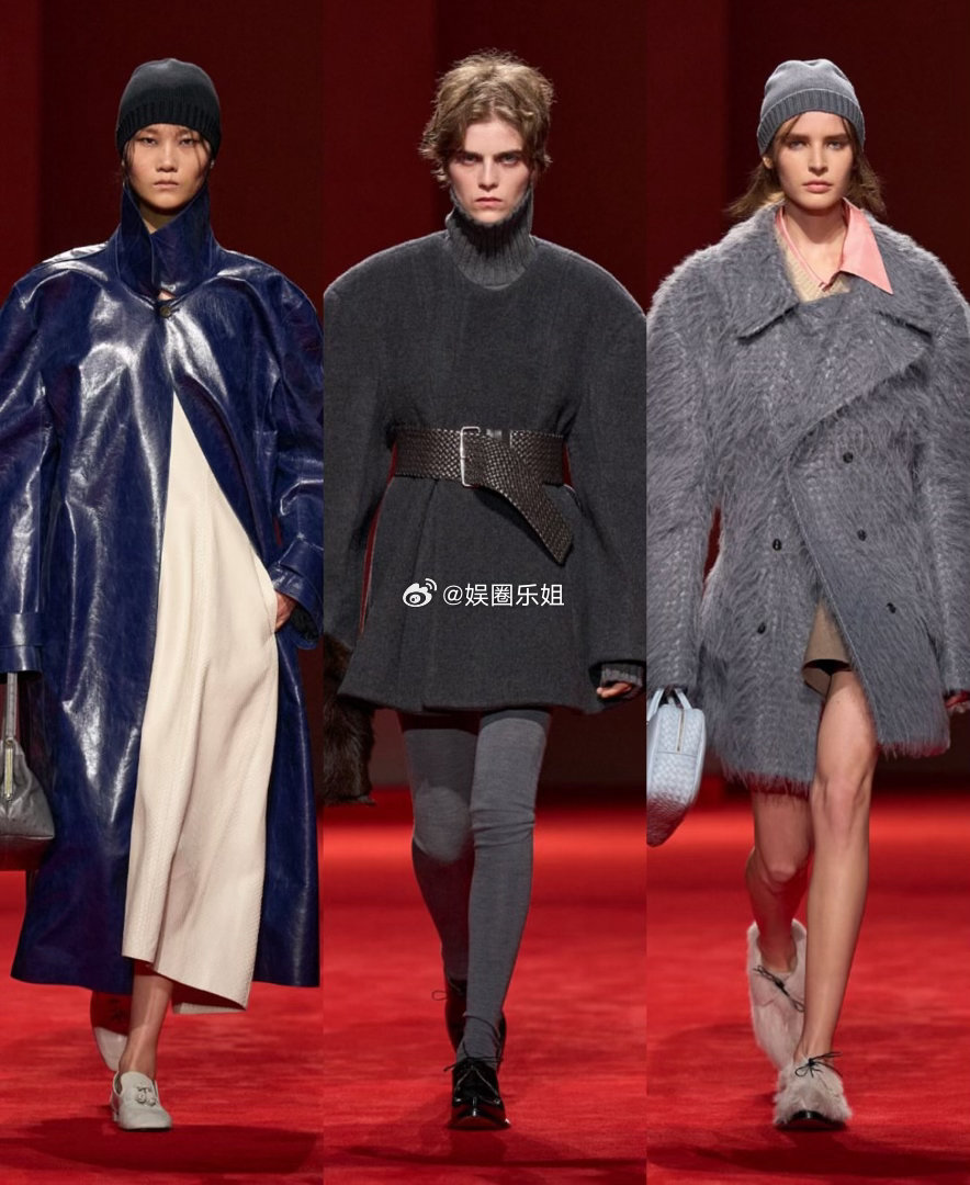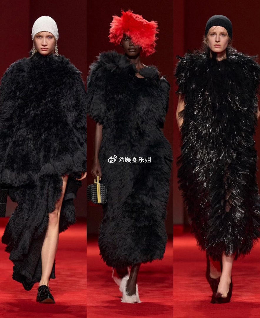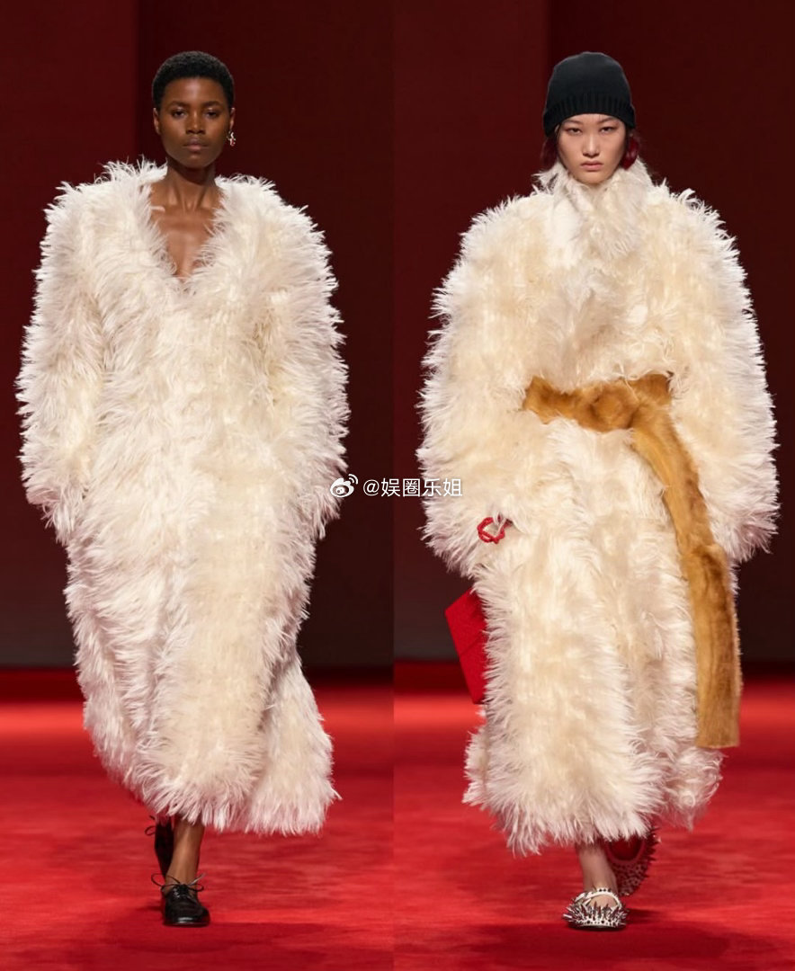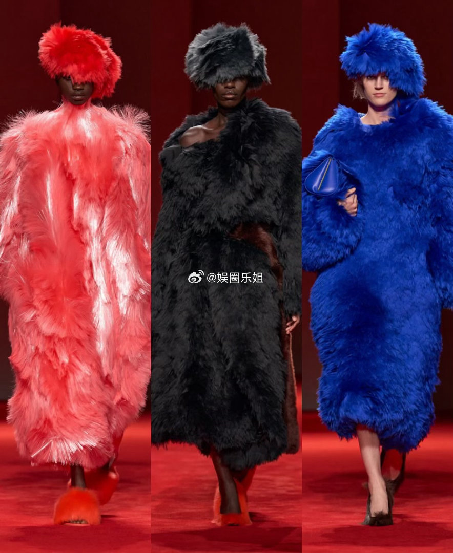 外套更是戏剧担当,超大皮毛一体、飘逸皮质斗篷、丰盈厚呢大衣,叠搭迷你裙或茧型针织,轮廓饱满却不失平衡。