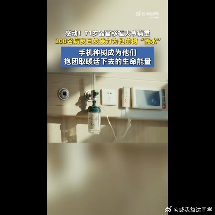 200位病友为临终老人的树浇水病友们每天的浇水,不只是给树,更是给彼此活下去的希望。孙大爷病重时,两百位病友都来给他的树浇水。如今大爷走了,女儿抱着树,把这份温暖延续了下去。老人离世前感谢病友为他的树浇水71岁老人离世后女儿抱了抱他的树