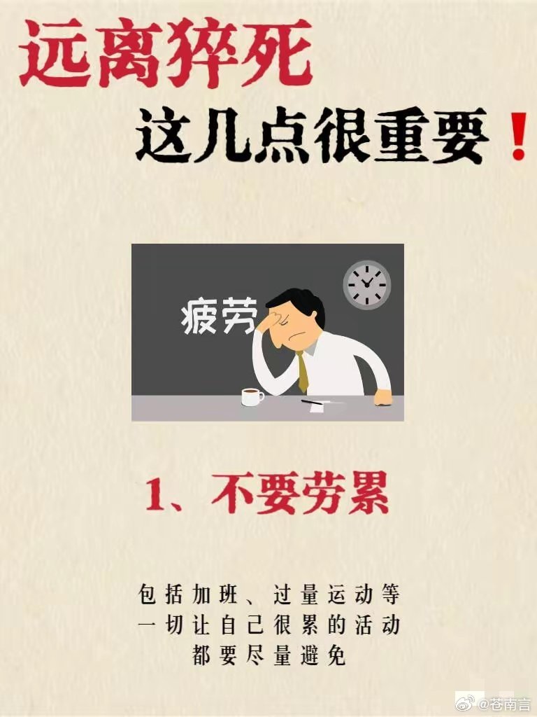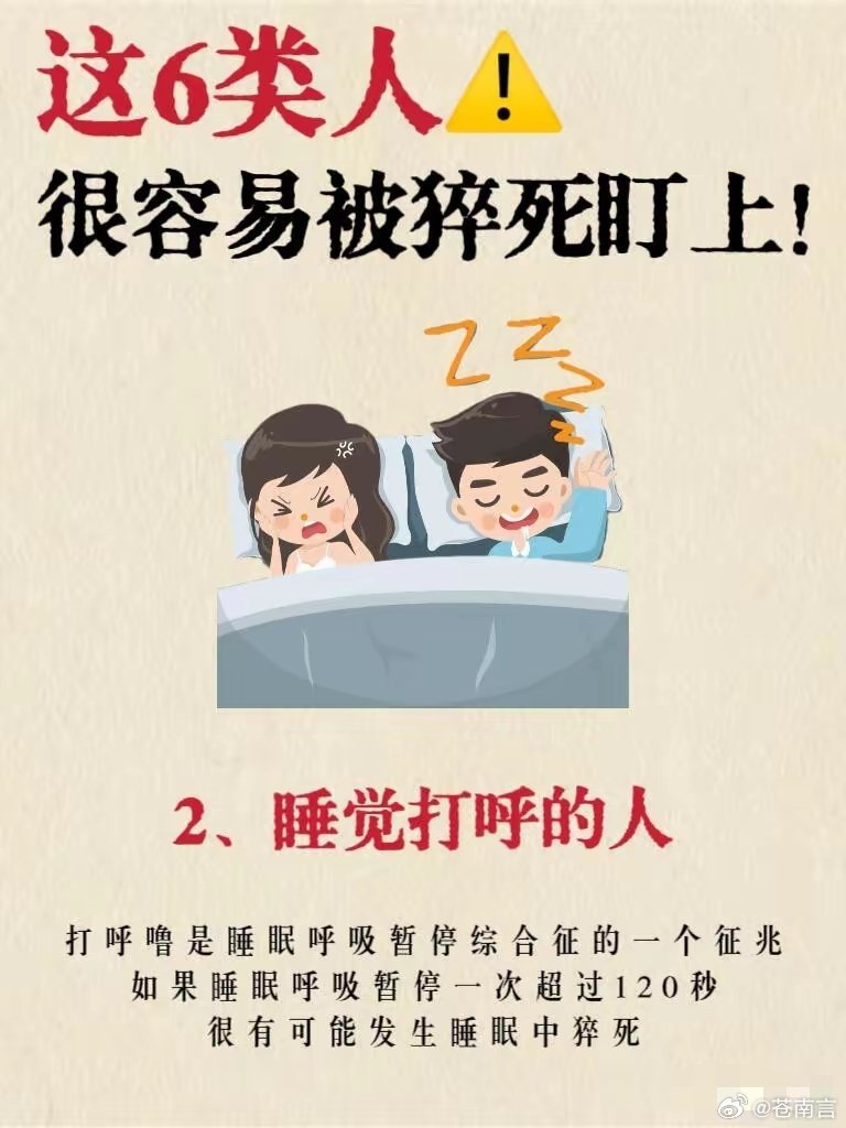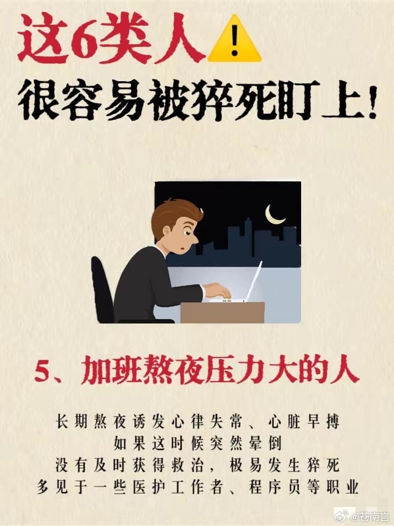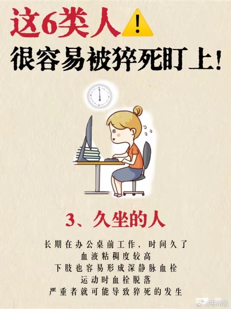 6类人高强度运动猝死风险高警惕!这6类人猝死风险更高,做好这些能有效避险⚠️猝死并非毫无征兆,它往往与长期不良生活习惯密切相关。以下6类人群是猝死高发群体,需格外注意:🔴 猝死高风险6类人群1. 爱出大汗的人:非运动、非高温环境下仍频繁大汗淋漓,甚至吃饭、静坐时也出汗。中医认为“汗为心之液”,过度出汗会耗损心脏气血,显著增加心脏疾病和猝死风险。2. 睡觉打鼾的人:严重打鼾是睡眠呼吸暂停综合征的典型表现。若单次呼吸暂停超过120秒,睡眠中发生猝死的风险将大幅升高。3. 久坐不动的人:长期伏案工作会导致血液黏稠度升高,易形成下肢深静脉血栓。血栓一旦脱落,可能引发肺栓塞等致命后果。4. 情绪易激动的人:频繁暴怒、情绪激动会导致血压剧烈波动,诱发急性心律失常,中老年人尤其容易因此引发猝死。5. 加班熬夜压力大的人:长期熬夜会诱发心律失常、心脏早搏。若发生突然晕倒且未得到及时救治,极易发生猝死,常见于医护人员、程序员等高压职业群体。6. 超负荷运动的人:盲目追求“累到极致”的运动方式,会给心脏造成极大负担。运动员、运动爱好者是这类风险的高发人群。🛡️ 远离猝死的关键措施1. 避免过度劳累:尽量减少熬夜加班、高强度运动等让身体透支的活动,保证充足休息,给身体和心脏留足恢复时间。2. 保持情绪稳定:学会管理情绪,避免暴怒、激动等剧烈情绪波动,可通过深呼吸、冥想等方式调节,稳定血压与心率。3. 坚持清淡饮食:减少高油、高盐、高糖食物摄入,避免暴饮暴食,防止血压、血脂、血糖异常,降低心血管疾病风险。4. 关注温度变化:过冷或过热环境都会加重身体负担。夏季避免大汗淋漓后立即进入低温空调房,防止血流速度骤变引发危险。💡 重要提醒:- 以上内容为健康风险科普与生活习惯建议,不能替代专业医疗诊断。若出现持续胸痛、心慌、头晕、呼吸困难等症状,应立即拨打急救电话并就医。- 文中提及的风险与建议基于常见健康风险科普,并非绝对结论,需结合个人体质调整生活方式。- 预防猝死的核心是规律作息、适度运动、稳定情绪、健康饮食,将这些习惯融入日常生活,是最有效的保护方式。