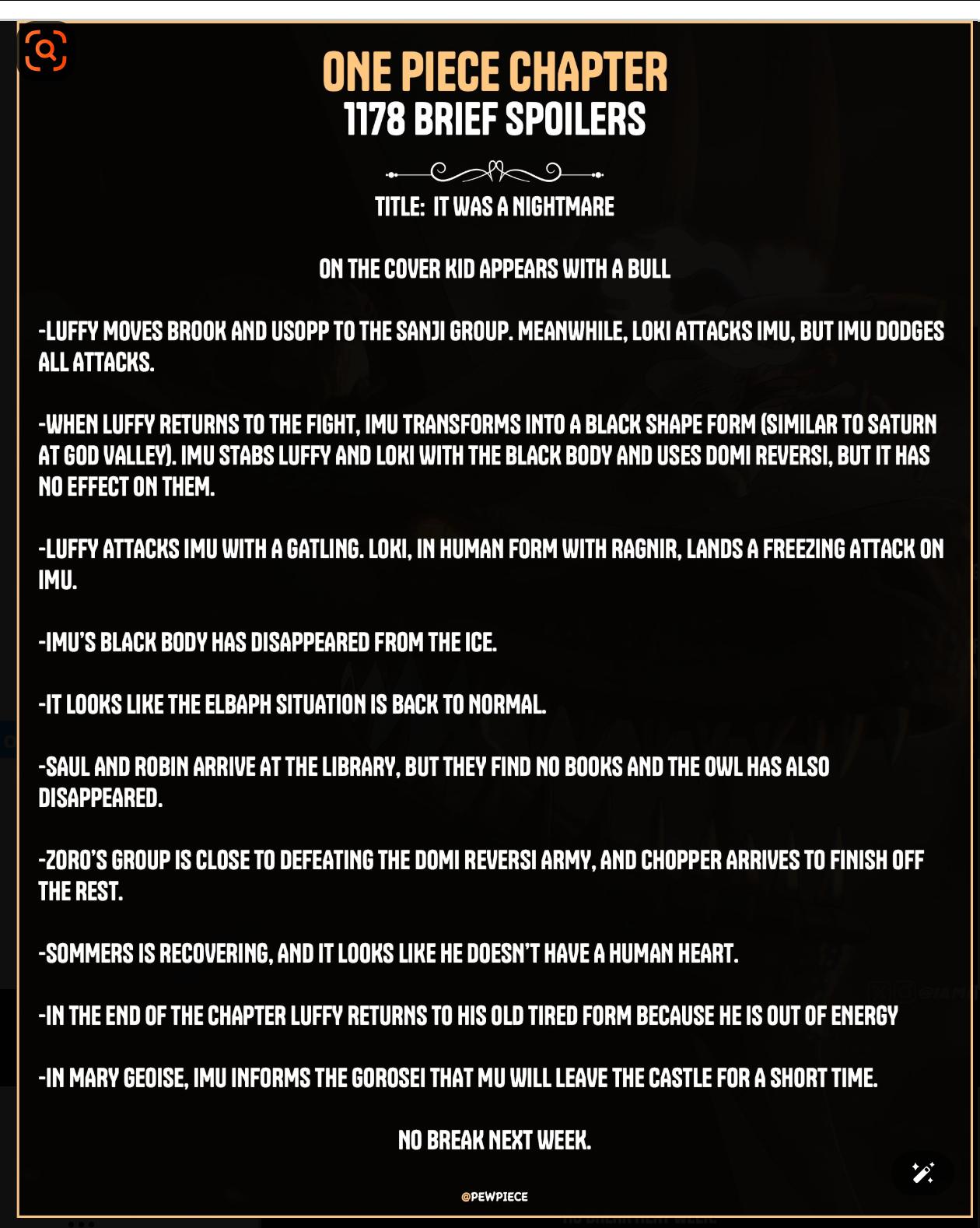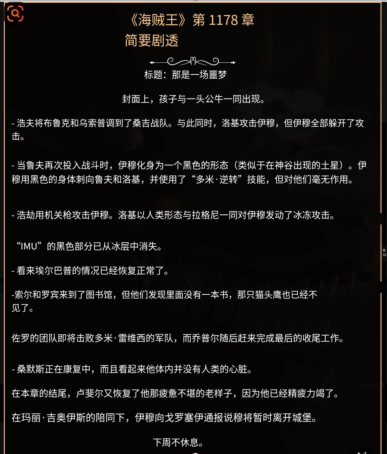 海贼王1178话情报更新,最新一话的标题为一场噩梦,场面是延续了之前伊姆和路飞和洛基三人之间的战斗。伊姆想通过黑转支配控制路飞和洛基结果都没有成功,猜测神级幻兽种果实是对抗伊姆的必要条件,霸气强如洛克斯都无法抵抗伊姆的控制,所以必须拿到他们这两颗果实才有一战之力,当年不管是洛克斯或是罗杰都没有拿到其中一颗果实才会所“来早了”,可能世界的大秘宝需要击败伊姆才能得到。[惊呆]