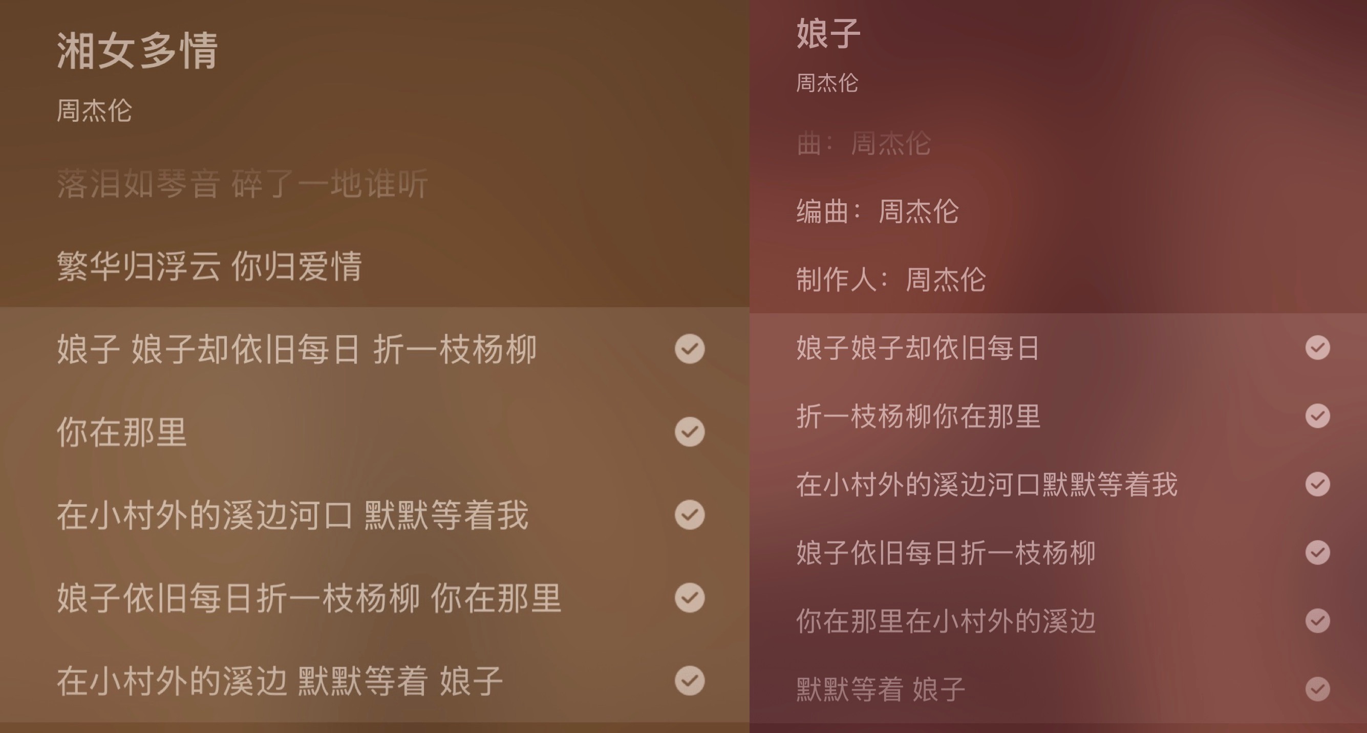 「湘女多情」该词典典故源自娥皇、女英寻夫的《楚辞·九歌》传说,象征坚贞的爱情与对理想的追求,方文山以此为主题,细腻地揉出中国古典与现代的委婉难言的愁绪,只能以景写意。歌词运用了大量的对比,例如:热闹的戏曲/沉默的人、凋落的花/铺满的爱,表达「执着」与「守候」两大主题。整首歌像一幅古代工笔画般,将湘女的惆怅思念之情、戏曲班和鸟的热闹喧哗、落花缤纷的浪漫,加上暮色渲染,成为一幅情长卷轴。湘女多情 中国风