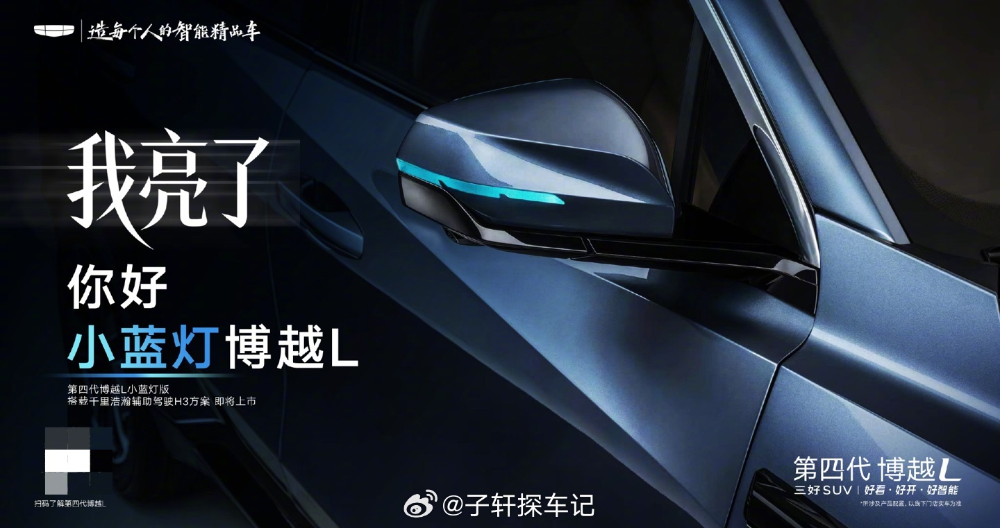 第四代博越L小蓝灯版,智驾一眼识别吉利官宣第四代博越L小蓝灯版,将于3月底上市。新车配备专属智驾小蓝灯与晴山蓝配色,搭载千里浩瀚H3智驾方案,支持高速与城市领航辅助。座舱搭载Flyme Auto系统,空间表现实用,基于CMA架构打造,兼顾家用与智能化体验。