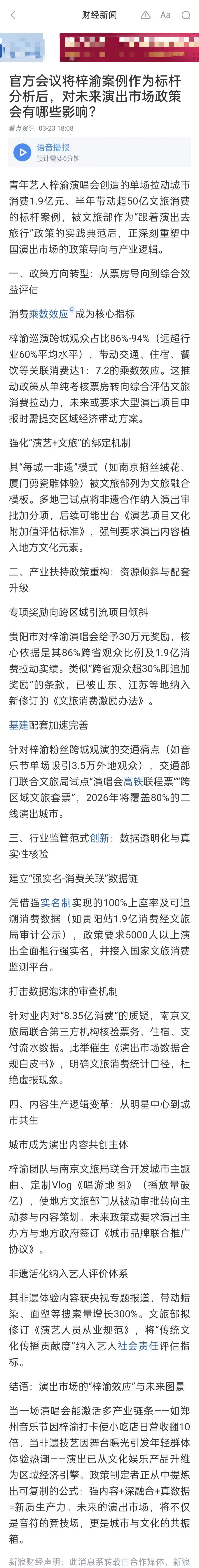 新浪财经报道;青年艺人梓渝演唱会创造的单场拉动城市消费1.9亿元、半年带动超50亿文旅消费的标杆案例。
