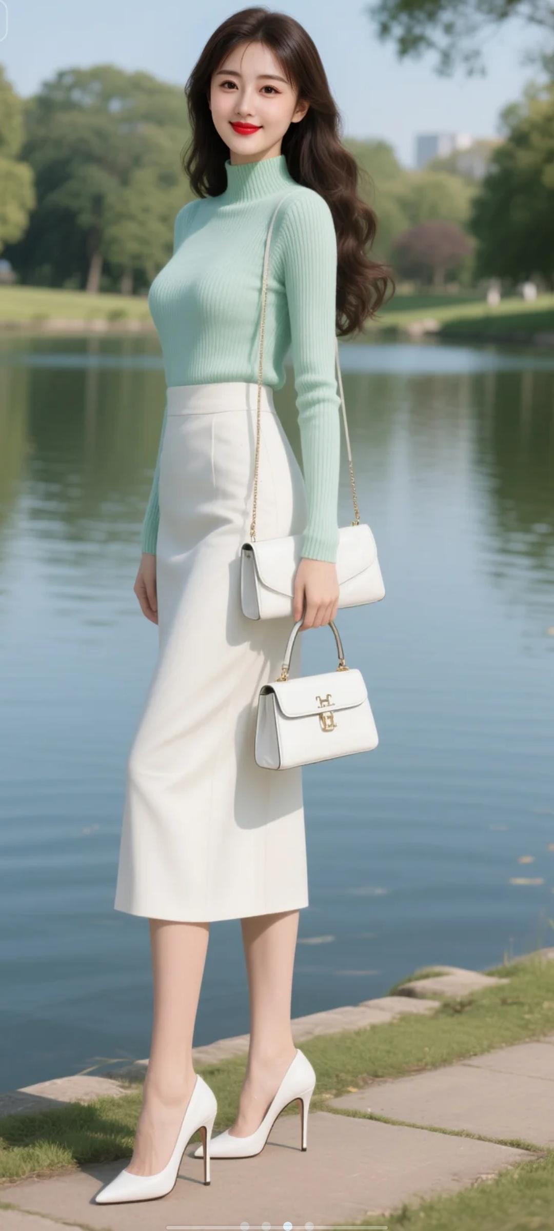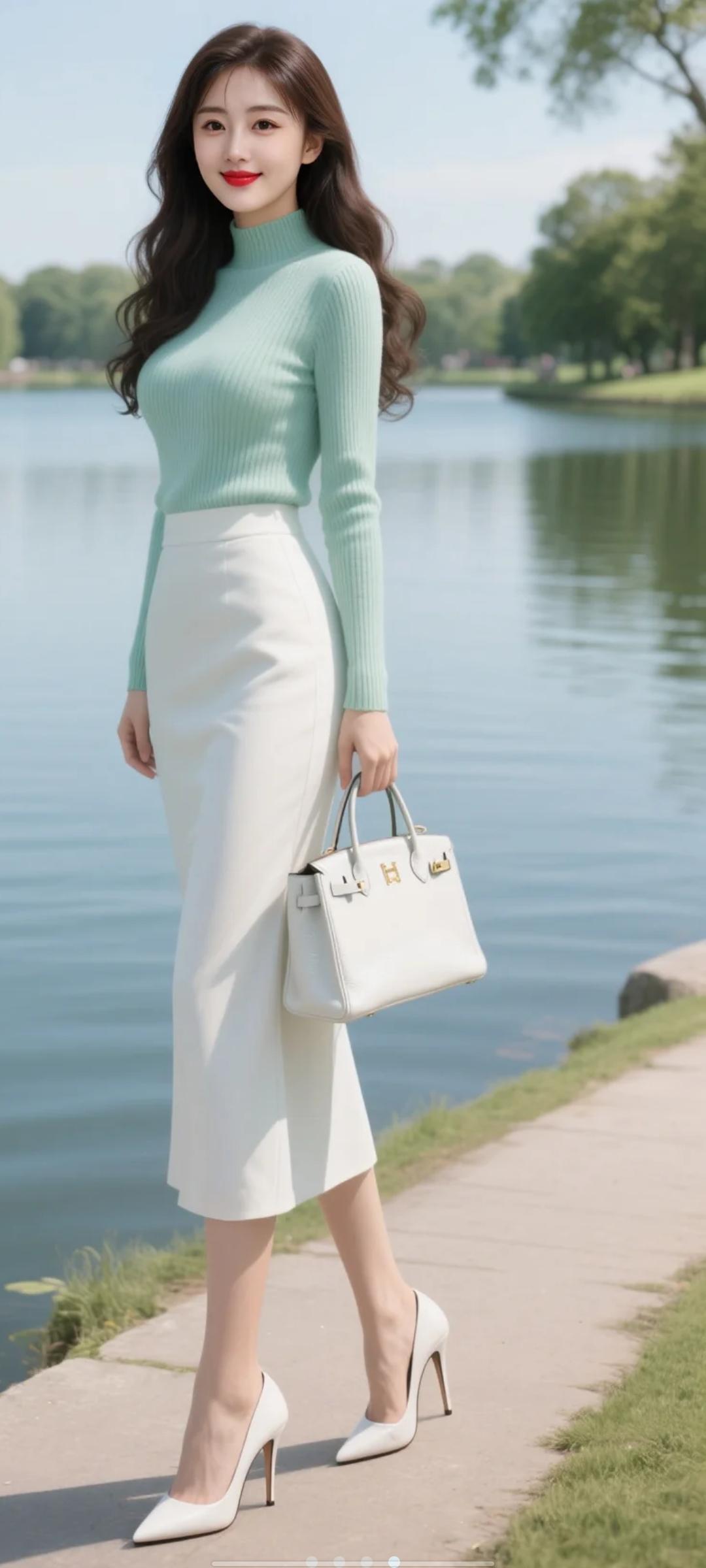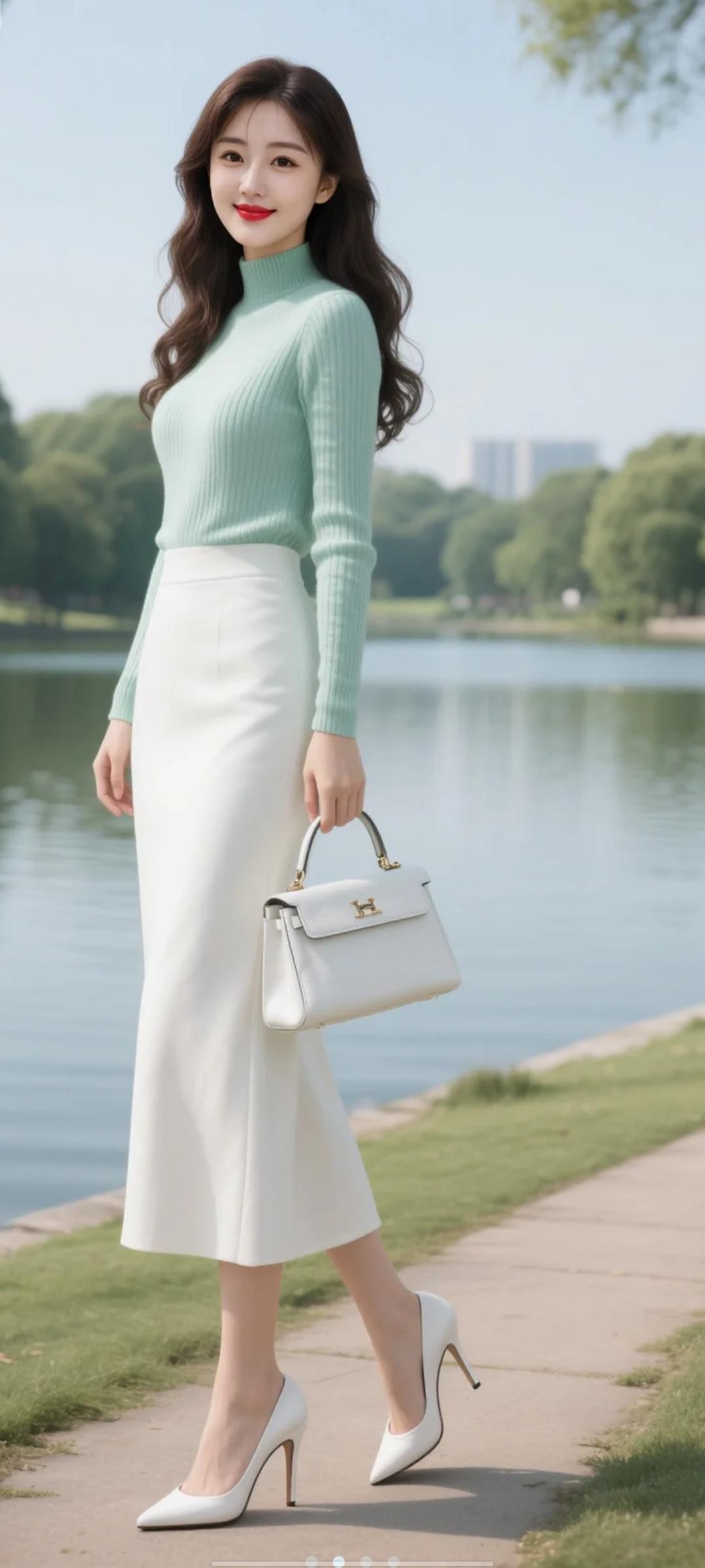 女生留着黑棕色长卷发,上身穿着薄荷绿中领针织衫,下身穿时尚长裙,手提白色爱马仕皮包。穿亮白色12厘米尖头超高细跟高跟鞋,站在湖边小道上,全身照,大师品质照高清,电影质感