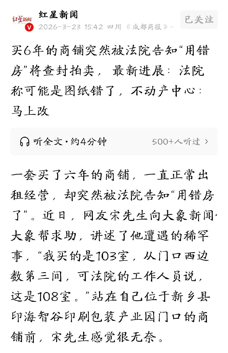 河南新乡,男子突然收到法院通知,要查封拍卖他的商铺。男子傻眼了,他从没做过违法乱纪的事,怎么就要查封他买了6年的商铺呢?原来,男子购买的是103号商铺,法院要查封的是108号商铺,由于当年第三方勘测机构测绘标错了方向,导致不动产登记的图纸错误,法院执意要按照不动产登记的情况来查封男子的这间商铺。男子求助记者后,不动产中心的做法终于让他舒了一口气。 新乡的宋先生,最近遇上了一件让他百思不得其解的糟心事。 他踏踏实实买了间商铺,6年来一直正常出租,却突然收到法院通知,说要查封拍卖。 这可把宋先生彻底吓傻了,他思来想去,自己从没做过任何违法乱纪的事,好好的商铺怎么就落得这个下场? 事情还要从2019年说起,当时宋先生在新乡某产业园,特意选了一间靠近出入口、人流量大的商铺,签合同、办房产证,所有手续都办得明明白白,合同和不动产权证上,清清楚楚写着是A1-2号厂房103室。 这六年里,宋先生一直按时交水电物业费,商铺也顺利租给别人经营,日子过得安安稳稳,他从来没觉得这套商铺会出任何问题。 可这份安稳,在2026年2月14日彻底被打破了。 宋先生突然收到法院发来的限期搬离通知书,看完内容他当场就懵了。 通知书上说,他用了六年的这间商铺,根本不是他房产证上的103室,而是属于河南某实业有限公司的108室,法院马上就要查封拍卖这套房子。 这个消息让宋先生又着急又无奈,租户也跟着陷入了困境。 他怎么也想不通,自己明明买的是103号,当时说的清清楚楚,从门口西边数第三间,现在怎么就变成108号了? 他翻出当初的购房合同,附件里的建筑设计规划图上,还特意用红笔标注了他买的商铺位置,就是现在正在使用的这一间,而隔壁那间空置的毛坯房,才是当初开发商说的108室。 交了六年费用,用了六年的房子,突然就成了别人的,宋先生心里又委屈又慌乱,却不知道该找谁解决。 无奈之下,宋先生只好求助记者帮忙。 记者先是联系了负责此案的法院工作人员,法院解释,他们原本也是要拍卖那间空置的108号毛坯房,可调取不动产登记的平面图后发现,图纸上标注的108室,正是宋先生在用的这间。 法院工作人员也坦言,看着像是图纸出了问题,但法院执行只能按照不动产登记的信息来,要是宋先生觉得登记有误,得先走行政程序改过来,法院才能调整执行方案。 听了这话,宋先生心里更没底了,只觉得这事遥遥无期,满是无奈。 随后记者陪着宋先生来到不动产登记和交易中心,工作人员仔细核查后,终于找到了问题根源。 原来是当年第三方勘测机构测绘时,因为商铺门前的路是斜向的,不是正南正北,工作人员直接把南北方向指反了。 图纸的问题导致整个房号编号颠倒,103室和108室的位置完全对调,因此不动产登记的图纸也就跟着错了。 依据《民法典》第二百二十条规定:权利人、利害关系人认为不动产登记簿记载的事项错误的,可以申请更正登记。不动产登记簿记载的权利人书面同意更正或者有证据证明登记确有错误的,登记机构应当予以更正。 本案中,因第三方测绘方向标反,导致不动产登记房号与实际房屋错位,登记内容存在明显错误。 宋先生作为权利人,有购房合同、原始规划图等证据证实登记有误,不动产中心应当为其进行更正登记。 查清问题后,不动产中心当场就为宋先生办理了不动产权证信息变更,重新出具的证书纠正了房号,彻底明确了商铺的归属。 拿到新证书的那一刻,宋先生终于松了一口气,心里的大石头总算落了地,之前的焦虑和不安全都烟消云散。 有了新的证据,宋先生就能拿着新房产证去法院提执行异议,证明这套商铺就是他的,避免被错误查封。 原本就是测绘错误,最后却让宋先生折腾了这么一趟,好在是有惊无险,商铺顺利的保住了。