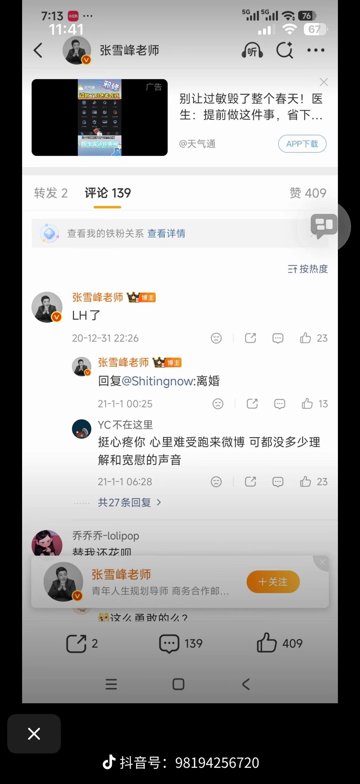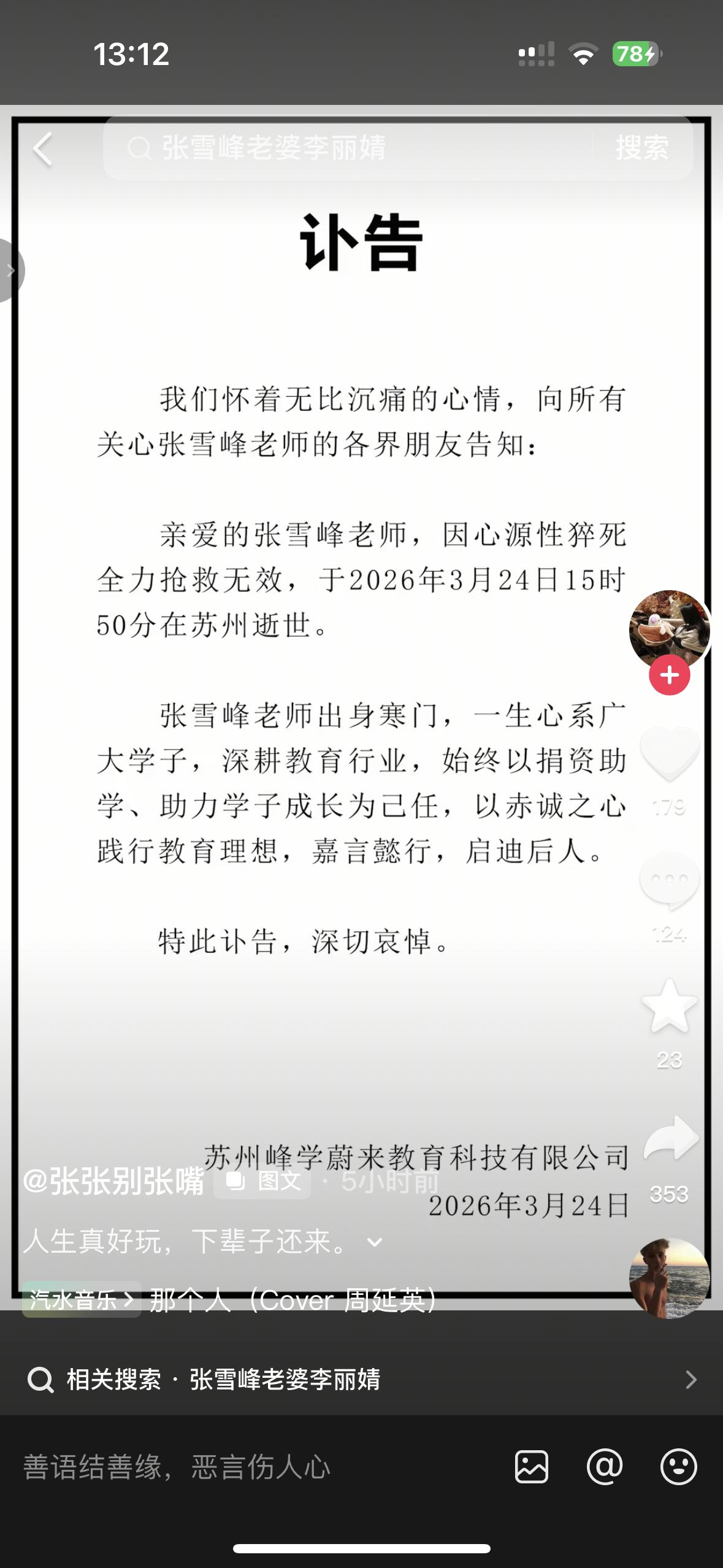 最难过的不是11岁的女儿,而是差一点成了他老婆的她 她发文:人生真好玩,下次还来!原来张雪峰老师早就离婚了!在20年离婚后,和她谈恋爱3年,并拿着离婚证跟她求婚过,因为她家里有人去世才没结婚的,如今她光明正大的晒证件照证明自己的地位,可惜张雪峰已经离开了,不然她该多么幸福呢
