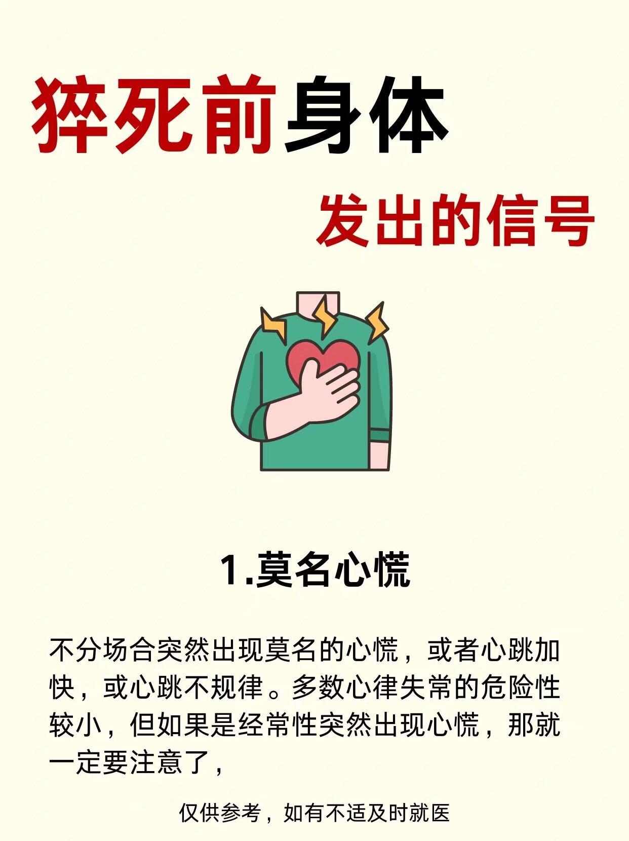 胸口刺痛几秒是小事吗?这些信号九成人曾忽略。 猝死看似突然,实则多数有迹可循。研究表明,超过半数猝死患者在事发前24小时内身体已发出明确警报,但高达90%的人将其误认为疲劳而忽视。心脏发出的求救信号主要有三类:一是间歇性胸痛或胸部压榨感,感觉像胸口被反复挤压,疼痛可能放射至左肩或背部;二是频繁心悸、呼吸困难与胸闷,常因心脏泵血功能下降导致;三是突发头晕、晕厥或眼前发黑,这是大脑供血不足的危险征兆。一旦出现这些症状,尤其是胸痛持续不缓解或频繁发作,必须立即就医。 心源性死亡 青年猝死 心肌猝死