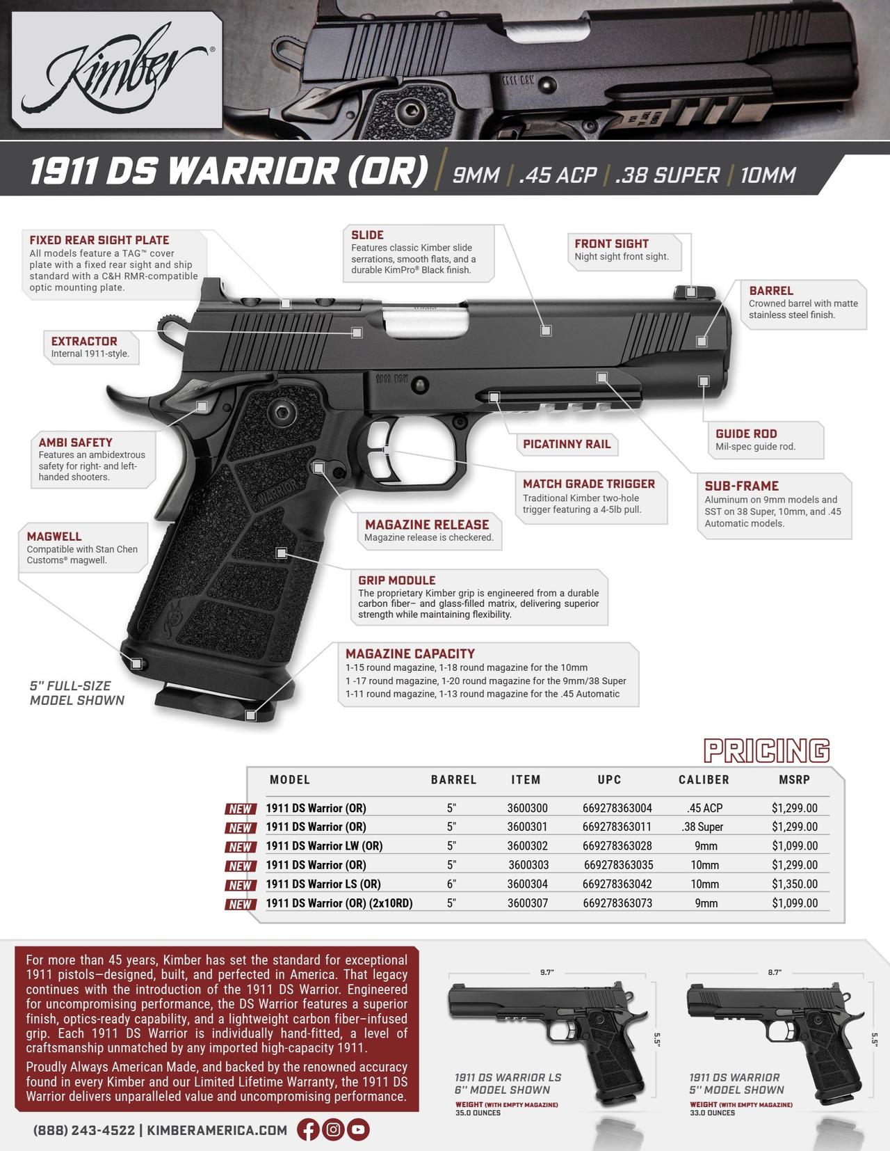 1911 Warrior战士系列,提供9mm、10mm、.45ACP和.38 Super口径选项,以及长套筒版本,起售价为每支1099美元。