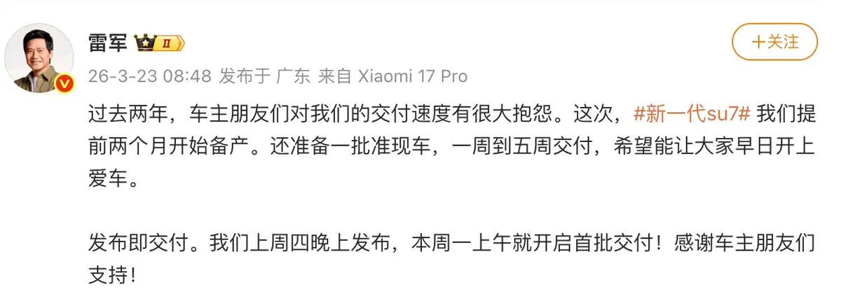面对来势汹汹的竞品,小米没有慌乱,也没有自乱阵脚,而是按自己节奏推进大规模交付,主打一个从容不迫、用实力说话。
