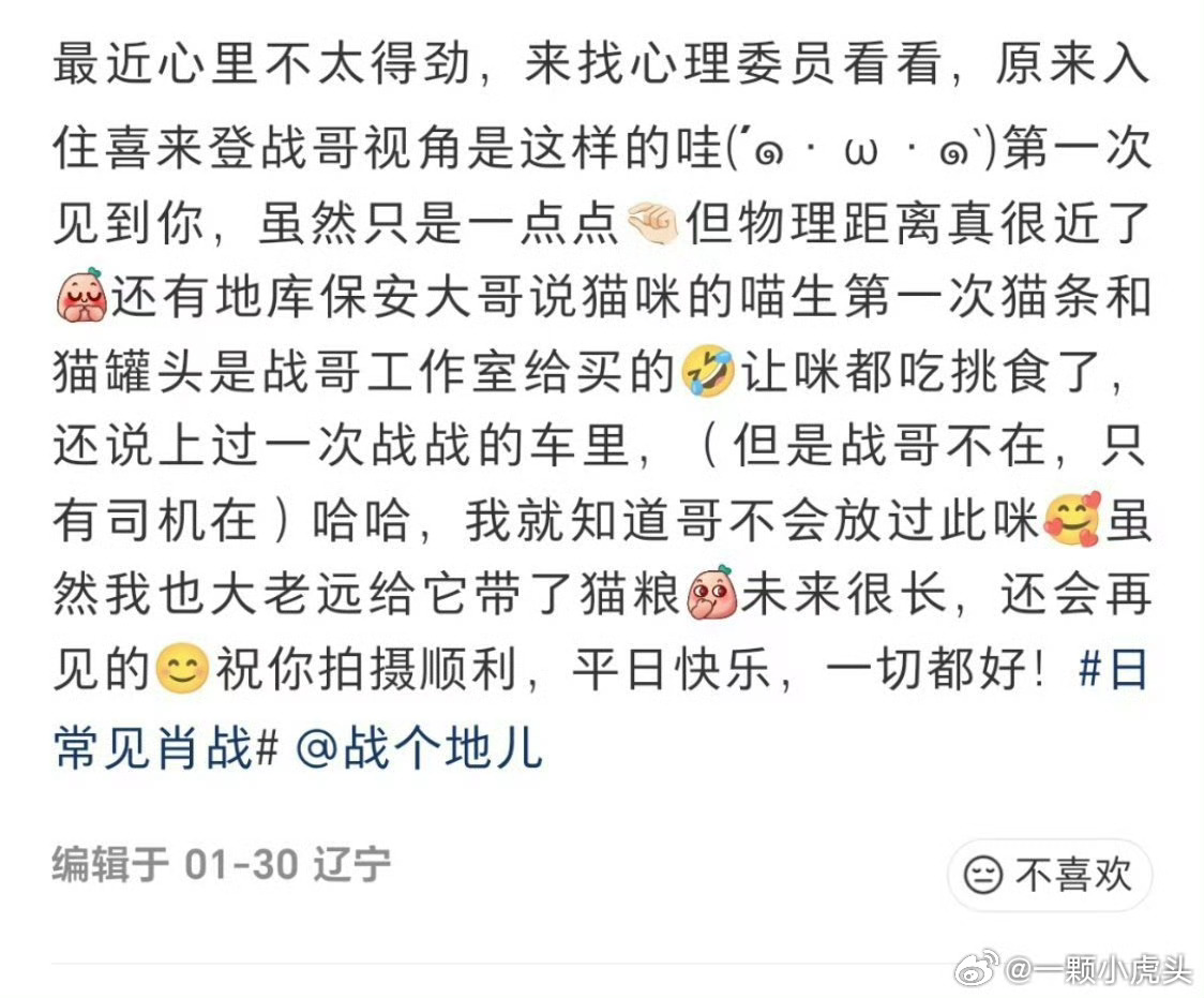 肖战锦州拍戏入住喜来登,他在地库发现一只猫咪,然后这只猫就被肖战工作室关照了,经