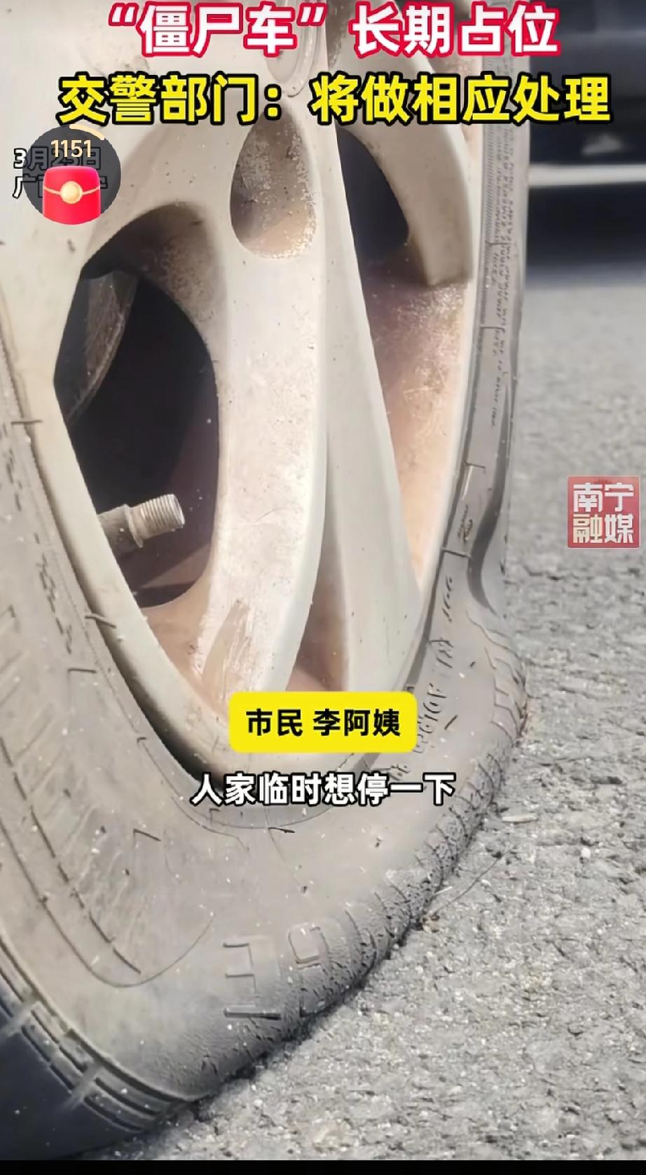 南宁街头有多辆“僵尸车”长期占用车位,这些车辆存在轮胎干瘪、车身落满灰尘和树叶、车内布满杂物等情况。市民李阿姨表示,这些车长期停放,影响卫生环境,还导致有急事的人没地方临时停车。对此,3月25号南宁市公安局交通管理支队兴宁大队民警表示,对于限时车位内长期停用且未挪移的车辆,会强制其挪移;对于报废车辆,已走流程上报单位,将由单位统一安排拖车或做相应处理。(来源于@南宁融媒)