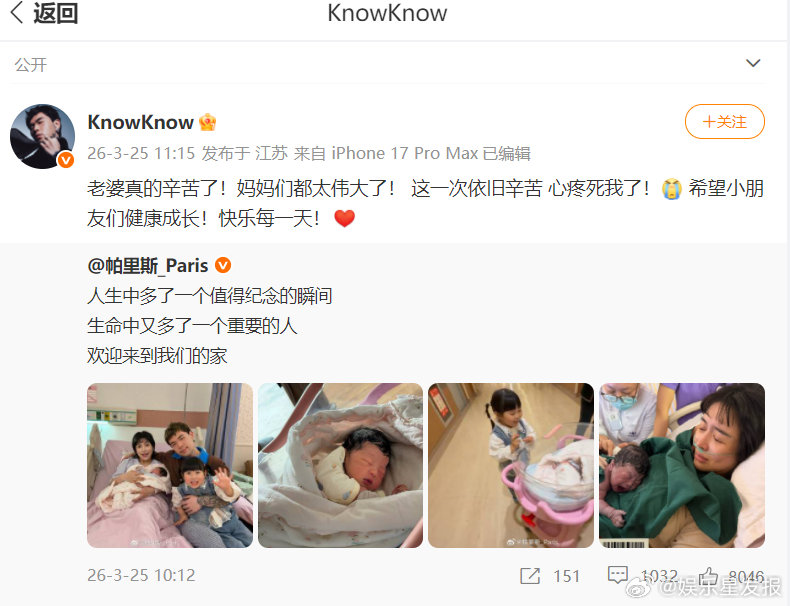 KnowKnow帕里斯二胎出生 恭喜KnowKnow和帕里斯迎来二胎宝宝,幸福家庭再添新成员!舞台有节奏,生活有温度,从二人世界到四口之家,每一份陪伴都满是爱意。祝宝贝平安顺遂,一家人永远温馨甜蜜,快乐翻倍